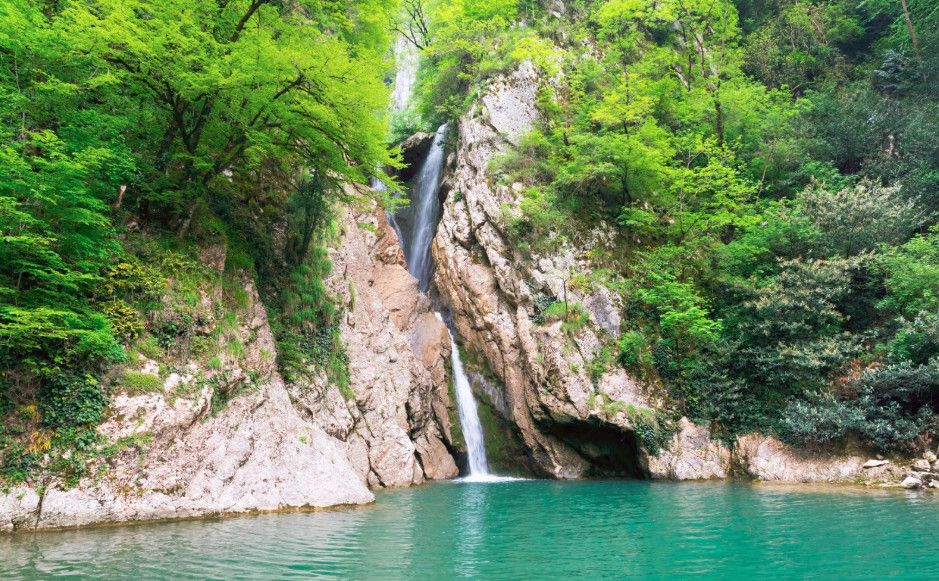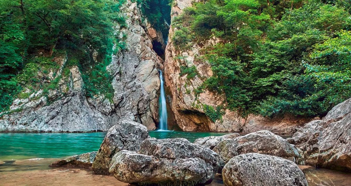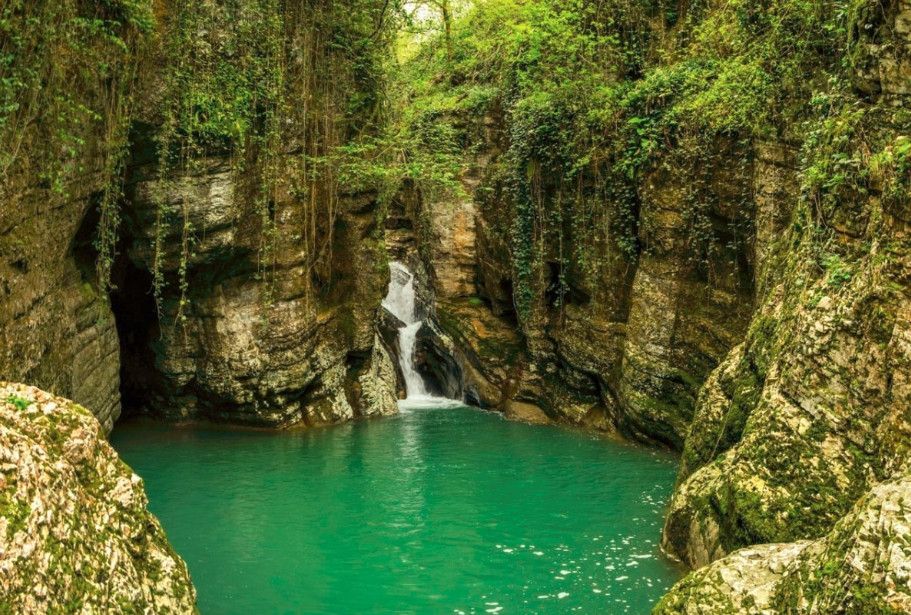 Агурские водопады расположены на реке Агуре в 4 км от побережья Черного моря (Хостинский район, Большие Сочи). Добраться можно рейсовым автобусом из Сочи (10 км) до остановки “Спутник”, а затем 4 км пешком вверх по течению реки Агура. Агура берет начало на склонах хребта Алек и, устремляясь к морю, создает живописнейшие каскады водопадов. Интересен нижний Агурский водопад, представляющий два каскада: верхний - 18, нижний - 12 метров. Под ним широкий и глубокий бассейн голубой воды. Дальше тропа вьется по берегу реки Агура. Через 500 метров - второй водопад. Далее - третий. По пути встречаются пещеры. Ущелье в любое время года утопает в зелени. Вблизи верхнего водопада (от тропы влево) высятся скалы, названные Орлиными. Это одно из популярнейших мест отдыха туристов и жителей Сочи.