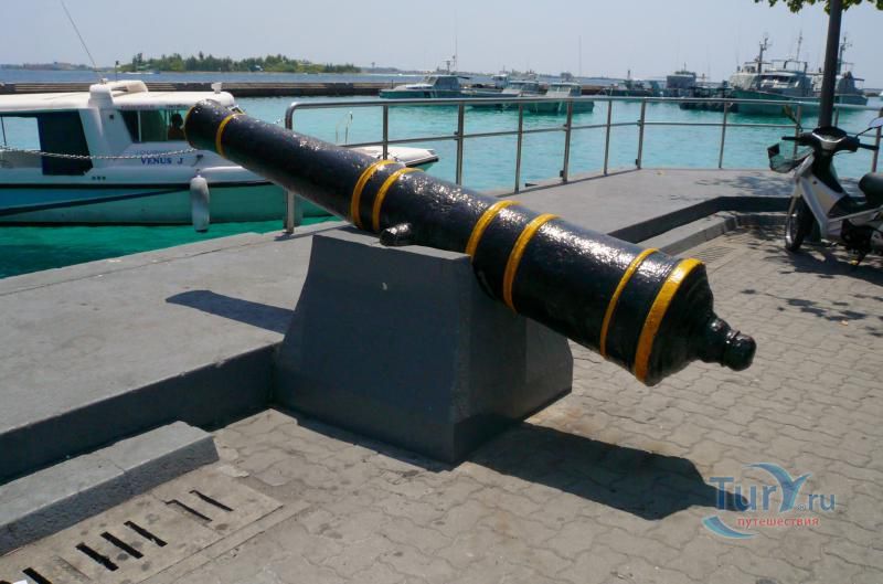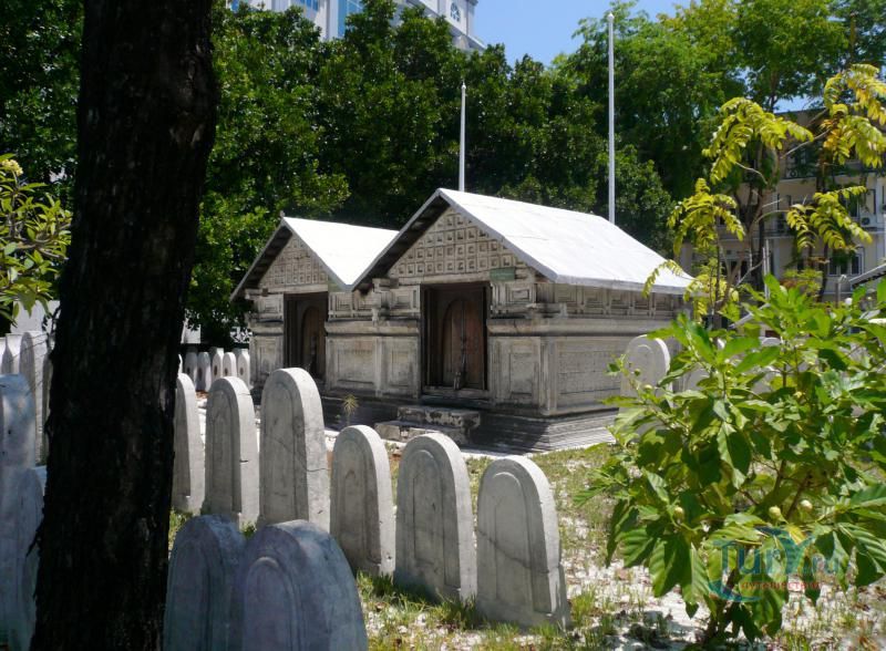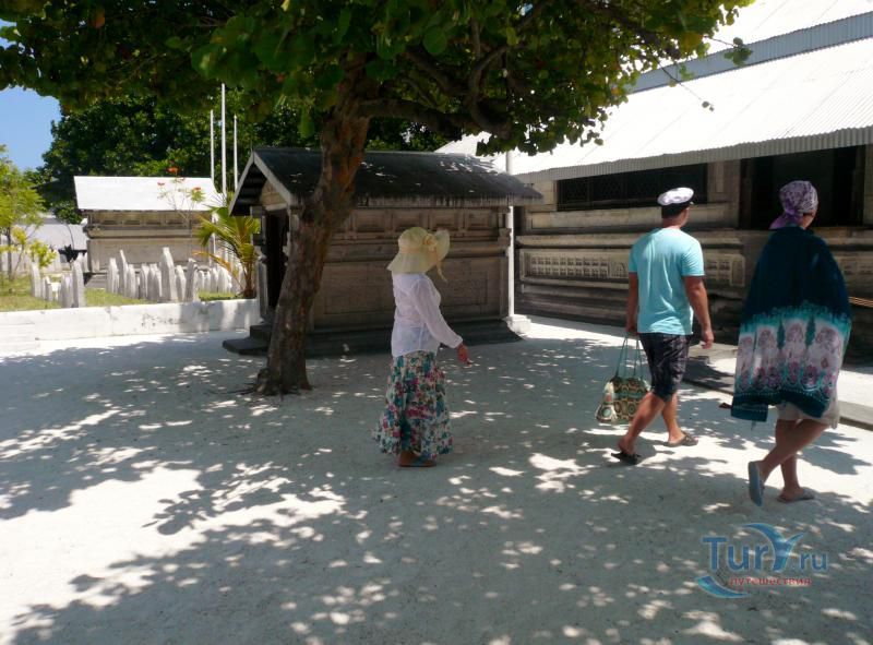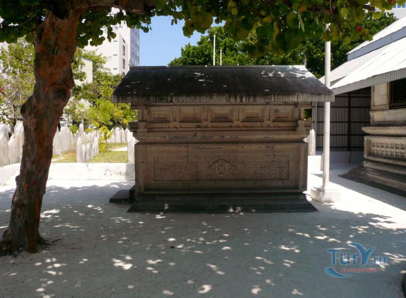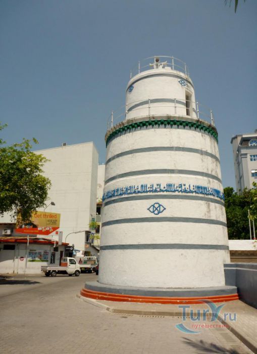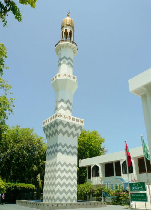 ХУКУРУ МИСКИЙ (HUKURU MISKIIY). Мечеть построена в 1656 г. султаном Ибрагимом Искандаром I. Это великолепный образец мастерства замечательных мальдивских ремесленников. Стены сложены из коралловых блоков, так плотно пригнанных один к другому, что просто невозможно заметить места их соединения. Интерьер украшен скульптурными панно из тикового и сандалового дерева, на которых вырезаны изречения из Корана и декоративные орнаменты. Мечеть стоит на месте языческого храма, посвященного Солнцу. Зал для молитв ориентирован на восток, а не на Мекку. Правоверным приходится поворачиваться лицом в угол зала, чтобы соблюсти правила мусульманской молитвы. Вход в мечеть разрешен только мусульманам. Туристы, желающие осмотреть мечеть, должны получить официальное разрешение в Управлении по религиозным делам, которое находится неподалеку. Рядом с мечетью возвышается странного вида минарет (Minnaruu). Белая цилиндрическая постройка с синими полосами наверху. Полосы обрамляют надпись на арабском языке, призывающую правоверных к молитве. Минарет был построен в 1675 г. по велению султана Ибрагима Искандара I. который, совершив хадж в Мекку, приказал воздвигнуть именно такой минарет.