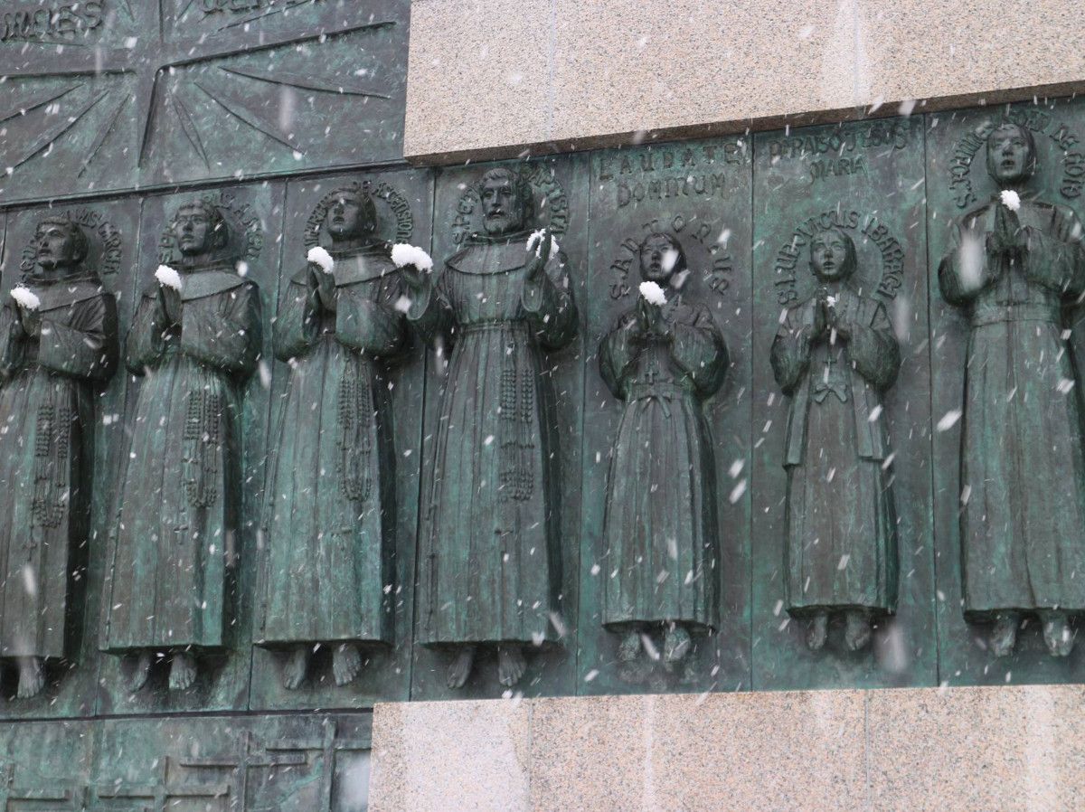 Католическая Церковь развила активную миссионерскую деятельность в Азии после образования испанских и португальских колоний. В 1493 году римский папа Александр VI поделил открытые земли между Португалией и Испанией и доверил миссионерскую деятельность различным монашеским орденам. Начиная с 1549 года, когда в Японию прибыл иезуит Франциск Ксаверий, католицизм стал постепенно распространяться на японском архипелаге. К концу 16-го века, когда в Японии усилилось политическое движение под руководством Тоётоми Хидэёси, там уже было несколько сот тысяч католиков. Гонения на католиков начались в 1587 году. Тоётоми Хидэёси использовал преследования христиан как ответ на экспансию европейских государств. В начале 1587 года по приказу Тоётоми Хидэёси были арестованы 26 католиков, которые были казнены 5-го февраля 1587 года. Арестованных христиан привезли в город Мияко, где по приговору им должны были отрубить уши и носы, однако, приговор был смягчён и им отрезали только часть левых ушей. Затем их провели по улицам города, чтобы, чтобы их вид заставил христиан отказаться от веры. Их лишили жизни одновременно, распяв на крестах. Поначалу их приковали к крестам на земле, которые потом воткнули в землю в ряд на расстоянии нескольких метров друг от друга. Потом каждого из них проткнули копьём. После казни их одежда и оставшаяся кровь были собраны местными католиками и их стали сразу же почитать святыми, приписывая им многочисленные чудеса.