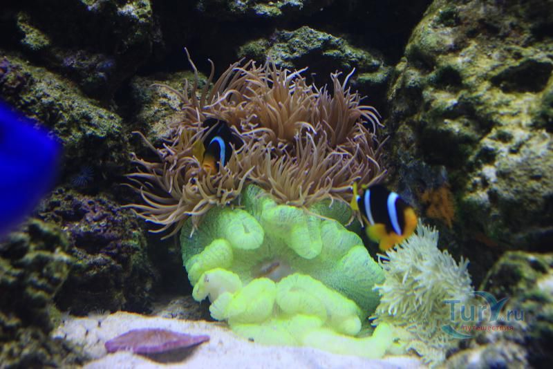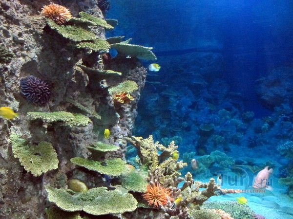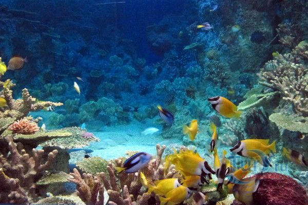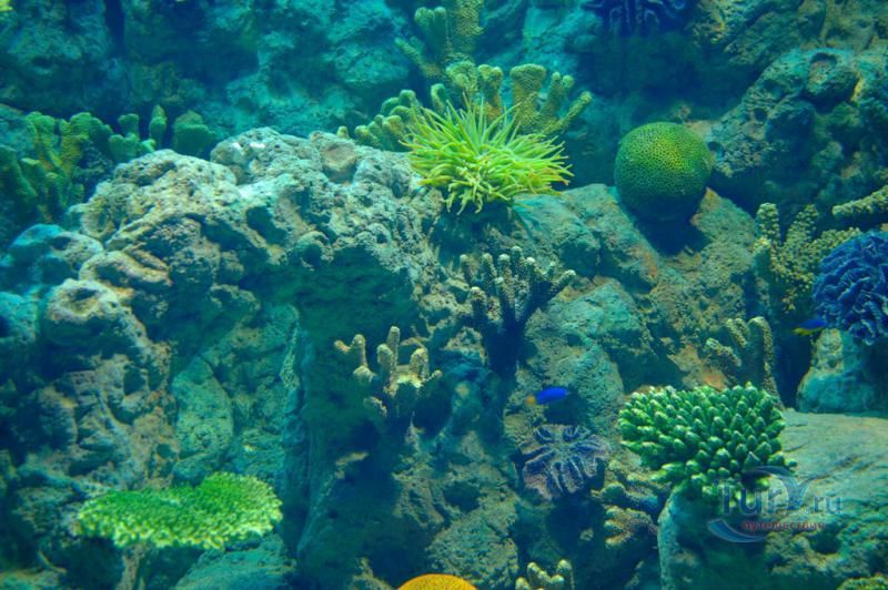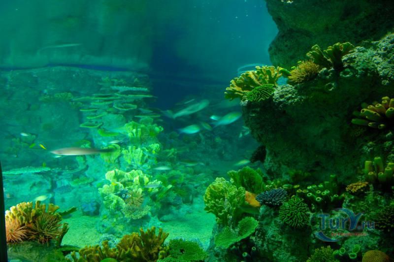 Спустившись по лестнице, из пресноводного мира окунаешься в мир океана. Сочетание двух аквариумов, представляющих собой прибрежную отмель и скалы, демонстрирует все разнообразие морской флоры и фауны: мурены, угри и губаны, от опасных и ядовитых рыб, милых морских коньков, медуз и живых кораллов.