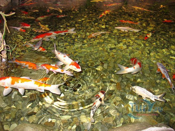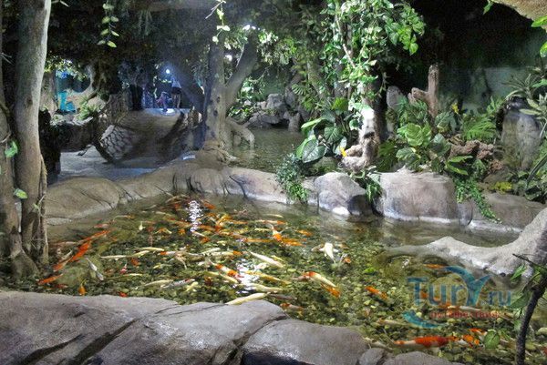 Первая экспозиция посвящена древним разновидностям рыб. Золотые рыбки в четырех соединяющихся аквариумах потрясают своей яркостью и красотой. В открытых аквариумах суетятся карпы «кои» и неспешно проплывают массивные арованы, паку и прочие представители пресноводных глубин. Одна из особенностей этой зоны – живописный водопад, который можно увидеть, зайдя на мостик, пролегающий через водоем.