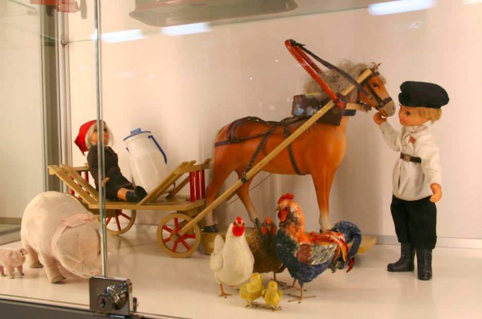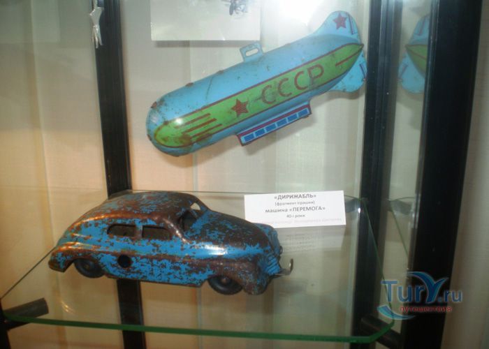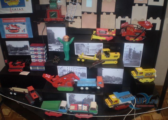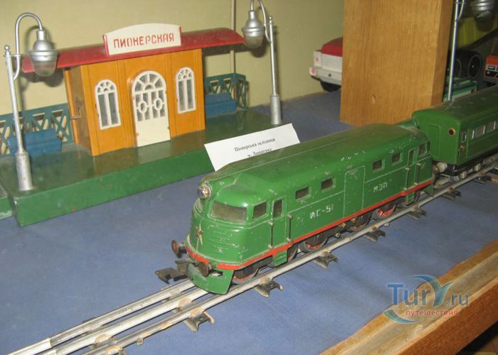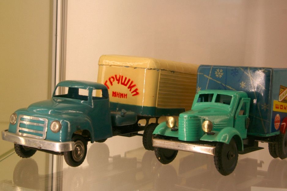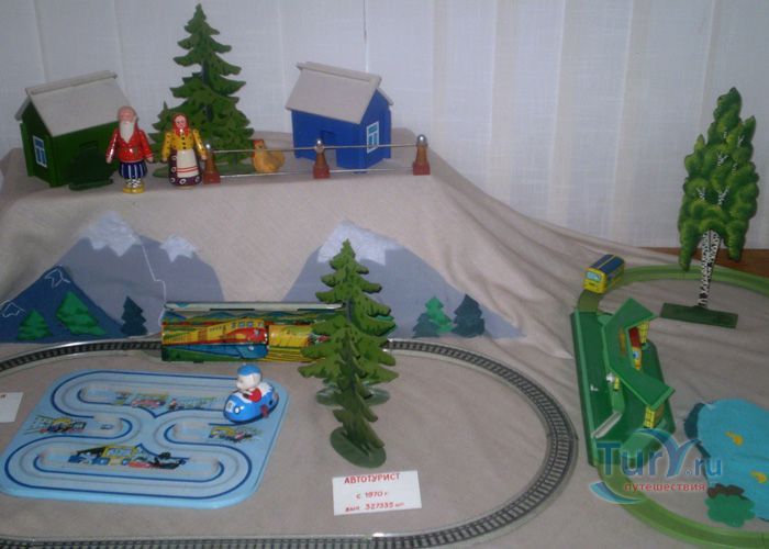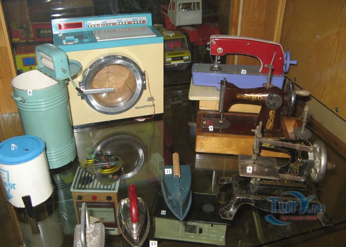 В экспозицию музея входят машины, экскаваторы, самолеты, большая игрушечная железная дорога с инициалами Сталина, промышленные образцы швейных машинок, игрушечные утюги и огромное количество старинных игрушек, которые на мгновение возвращают взрослых в далекое детство.