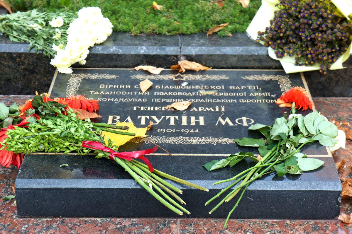 На основании мемориала надпись на украинском языке, гласящая: «Вірний син Більшовицької партії, талановитий полководець червоної армії, що командував Першим Українським фронтом, генерал армії Ватутін М.Ф. 1901 - 1944».