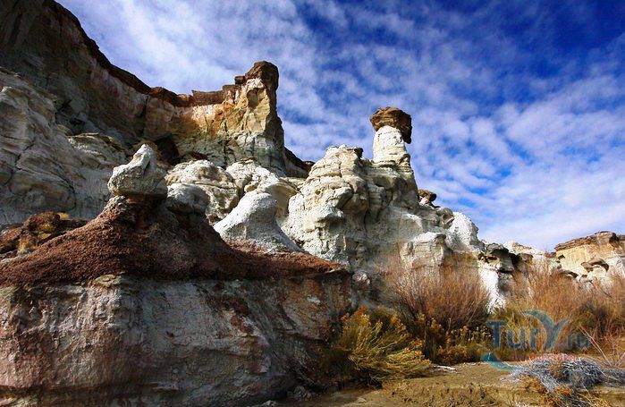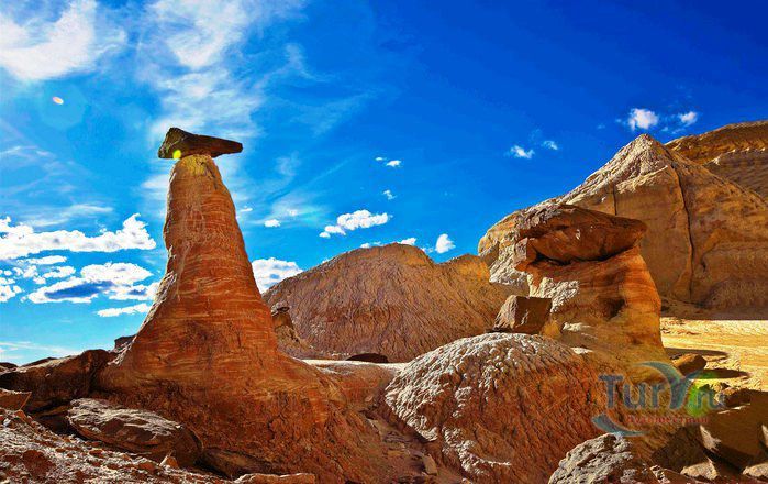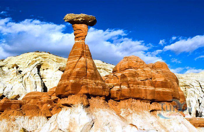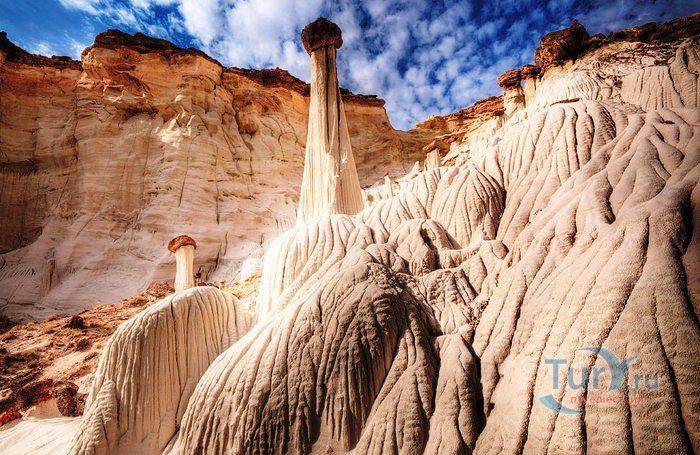 Грибообразные скалы или каменные грибы — это удивительные естественные образования, над которыми природа трудилась многие миллионы лет. Из-за того, что диаметр основания скал меньше диаметра верхней их части, они действительно похожи на грибы. Наиболее часто грибообразные скалы встречаются на американском Юго-Западе. Каменные грибы — это выветренные скалы. Они состоят из легко разрушаемых пород в основании скалы и более устойчивых пород вверху. Выделяют еще несколько причин образования грибообразных скал: из-за более резких колебаний температуры в приземном слое воздуха, что вызывает быстрое разрушение нижней части; под влиянием морозного выветривания при наличии снега; в результате сильного разъедания внизу соляными растворами, поднимающимися из грунта. Тысячелетиями песок, гонимый ветром близко к поверхности земли, действовал как наждачная бумага и подтачивал основания скал. Некоторые грибообразные скалы состоят из 2-х разных пород, одна из которых лежит наверху другой. Это могло образоваться в результате камнепада или землетрясения: Удивительное зрелище: камни разных форм и размеров балансируют на белоснежных колоннах, напоминая своими очертаниями гигантские грибы или закутанных в плащи пилигримов: Больше всего «каменных грибов» встречается на Юго-Западе США.