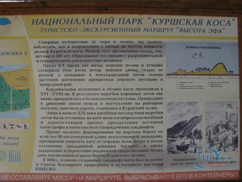 Маршрут «Высота Эфа» протяженностью 2,8 км проложен на 42 км Куршской косы в окрестностях поселка Морского — наиболее живописного из всех поселков косы. Он выведет вас к дюне Ореховой (Петш), самая высокая точка которой (64 м) была названа высотой Эфа в честь лесовода Франца Вильгельма Эфы, чья деятельность была посвящена изучению и закреплению подвижных песков. Песчаные дюны Куршской косы (до 60 м высотой) одни из самых высоких в Европе. С обзорных площадок открывается все великолепие ландшафтов косы: море, залив, открытые белые дюны, подвижные пески, лесные пространства, уютные домики поселка Морского.