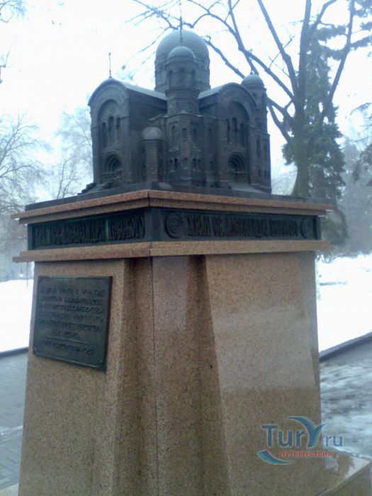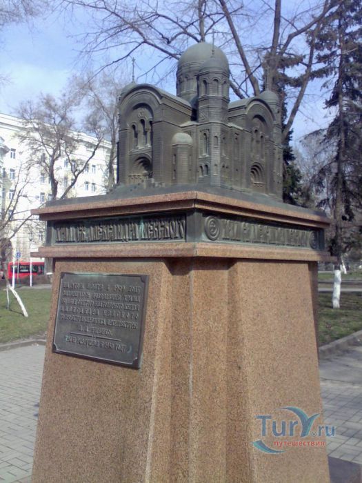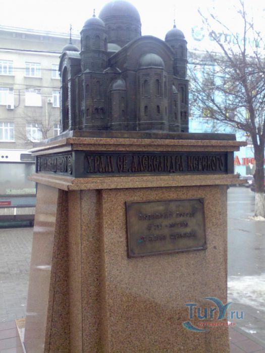 В месте пересечения Ворошиловского проспекта и улицы Большой Садовой в г.Ростове-на-Дону установлен небольшой памятный знак с уменьшенной копией (в масштабе 1:50) некогда существовавшего величественного собора. Недалеко от того места, где когда-то стоял сам храм - Алекса́ндро-Не́вский собо́р – кафедральный собор Ростова-на-Дону. Собор возвышался на Новой Базарной площади, на пересечении Большой Садовой улицы и Большого Столыпинского проспекта (ныне – Ворошиловский проспект). В 1875 году в «память избавления от покушения на жизнь императора Александра II 4 апреля 1866 года» на месте будущего Александро-Невского собора, по эскизу архитектора С. Загоскина была заложена временная церковь. В 1887 году городская дума решила построить не часовню, «а обширный, величественный и богатый храм, украшенный живописью». Определили место большого храма на части Новобазарной площади, примыкающей к Большой Садовой улице. Проект Александро-Невского собора разработал архитектор-академик А.А.Ященко, зодчий Новочеркасского войскового Вознесенского собора. В 1891 году состоялась закладка первого камня. Строительство собора продолжалось 16 лет и завершилось в 1908 году. 17 августа того же года собор был освящён, но, ни архитектор А.А.Ященко, ни главный жертвователь купец П.И.Ильин не дожили до этого момента. На протяжении всего своего существования Александро-Невский собор оставался доминантой Новобазарной площади, её композиционным центром. В 1930 году собор был разрушен. На его месте возникла площадь Советов и здание исполкома Ростовского областного Совета депутатов трудящихся, (ныне областная администрация). В 1972 год в центре площади установили памятник освободителям Ростова от белогвардейцев, скульптора Вучетича Е.В. В 90-х годах XX века высказывались предложения о восстановлении собора, однако нигде не сохранилось чертежей разрушенного собора, по которым можно было его воссоздать. До своего разрушения, собор был самым большим культовым сооружением и самым высоким зданием города.