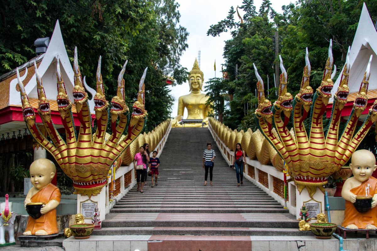 На площадке перед подъёмом продают птиц в клетках, которых поднявшись на вершину выпускают на волю - «на счастье». Далее - длинная красивая лестница в 120 ступеней, на всем лестничном пролете расположены мифологические золотые семиглавые змеи (Наг) - обитатели тайских святилищ. Пройдя все ступени и повернув налево увидите небольшой храм для молитвы. У входа снимается обувь, вносятся пожертвования в специальную ёмкость для сбора денег, можно выбрать аромопалочки, цветы. Цветы кладут на тарелку, а аромопалочки зажигают на специальной подставке. Внешний ритуал соблюдён, внутренний — на ваш выбор.