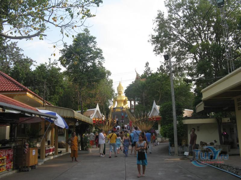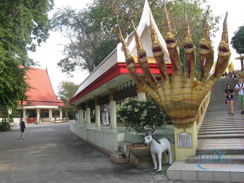На площадке перед подъёмом продают птиц в клетках, которых поднявшись на вершину выпускают на волю - «на счастье». Далее - длинная красивая лестница в 120 ступеней, на всем лестничном пролете расположены мифологические золотые семиглавые змеи (Наг) - обитатели тайских святилищ. Пройдя все ступени и повернув налево увидите небольшой храм для молитвы. У входа снимается обувь, вносятся пожертвования в специальную ёмкость для сбора денег, можно выбрать аромопалочки, цветы. Цветы кладут на тарелку, а аромопалочки зажигают на специальной подставке. Внешний ритуал соблюдён, внутренний — на ваш выбор.
