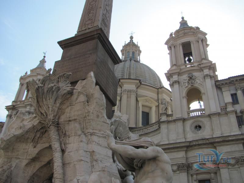 Что же представляет собой фонтан Четыре реки? Вокруг привезенной императором Каракаллой из Африки колонны разлилось искусственное озерцо, а в его центре расположились аллегорические фигуры четырех рек, символизирующих континенты. Европу представляет Дунай, Индию – священный Ганг, Нил – Африку, и Америку – Ла Плата. Каждое из божеств сопровождают звери: азиатскую реку – лошадь, африканского бога – лев. Группа получилась очень живой, динамичной. Боги рек, кажется, только что вдруг чудесным образом оказались на пьяцца Навона, и сами удивлены этим. Дунай осматривает колонну, Нил завернулся в покрывало, а мавр Ла Плата в ужасе отпрянул. С этим связана еще одна легенда, которую любят рассказывать экскурсоводы. Якобы в образе ужаснувшегося Ла Плата Бернини тонко отомстил недоброжелателям. Если проследить направление смятенного взгляда божества, окажется, оно смотрит на стоящую напротив церковь Санта Аньезе, по проекту Боромини, соперника Бернини. Известно, что мастер был недоволен собором, считал, что он портит весь ансамбль площади. Вот мавр и ужасается архитектурной безвкусице Санта Аньезе. Надо отдать должное остроумию этой легенды, но историческая справедливость требует внести поправку: собор был построен несколькими годами позже фонтана. А мавр, по замыслу Бернини, ужаснулся при виде каменной змеи, которая намерена, кажется, покуситься на его золотые монеты.