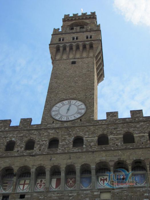 Заслуживает особого внимания дворец - Палаццо Веккьо (или Старый Дворец) на площади Синьории. Это правительственное здание 1299 г., где заседали приоры, называлось Новый дворец (Palagio novo). Прежнее правительственное здание Барджелло стало Старым дворцом. В XV в. правители коммуны объявили себя синьорами(signori), а само здание стало называться Палаццо делла Синьория, дав тем самым название и площади перед дворцом. Изначально его строили как крепость для защиты резиденции приоров по проекту Арнольфо ди Камбио. Строительство началось в 1294 г. Далее в работе участвовали такие мастера, как Буонталенти, Вазари и Кронака. Дворец представляет собой довольно мощное здание с высокой башней и мраморными скульптурами по обеим сторонам входа. Сейчас во дворце находится муниципалитет города. Палаццо Веккьо был сооружен по образцу более старого административного дворца Палаццо Тоскана в городе Вольтерра, но выглядит намного мощнее и кажется вырубленным из одного куска скалы. Проект предусматривал чёткие формы: в плане это прямоугольник, но тонкие карнизы по фасаду зрительно делят его на три блока. Увенчанная зубцами галерея как бы повторяется на звоннице и на башне, высота которой достигает 94 м, дополняя впечатление величавой простоты. В 1667 г. на башне были установлены часы работы аугсбургского мастера Г. Ледерле, которые до сих пор ходят.