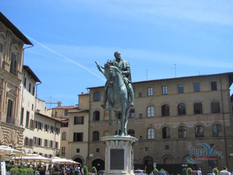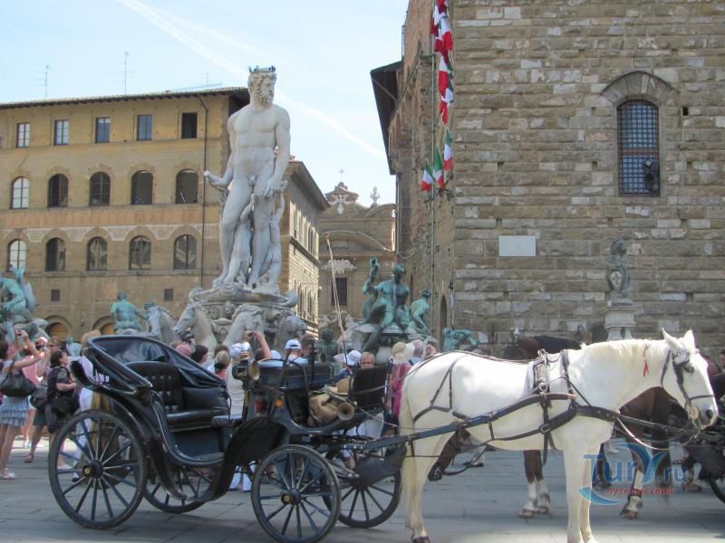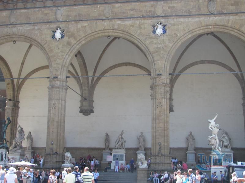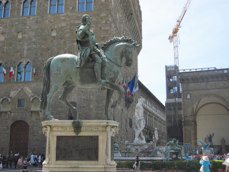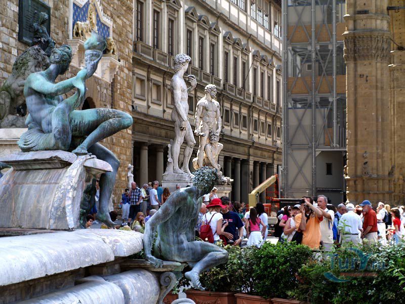 В центре площади находится Фонтан Нептуна и конная статуя Козимо I Медичи. Здесь Вы можете полюбоваться такими скульптурами, как «Персей» - творение рук Челлини и, конечно же, безупречным Давидом, создателем которого является Микеланжело. Правда, на площади поставили копию скульптуры, а саму ее поместили в музей. Окружают площадь здания постройки XIV-XVI веков, такие как, например, Торговый Суд и Палаццо Угуччони.
