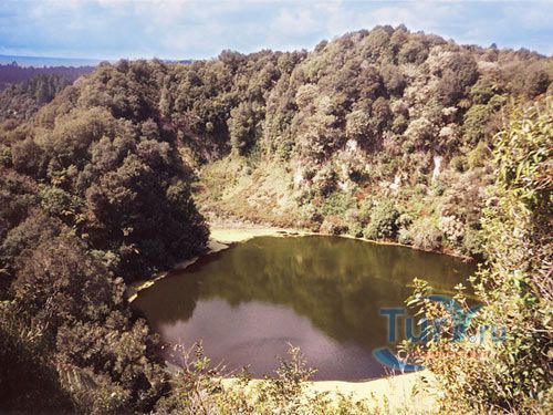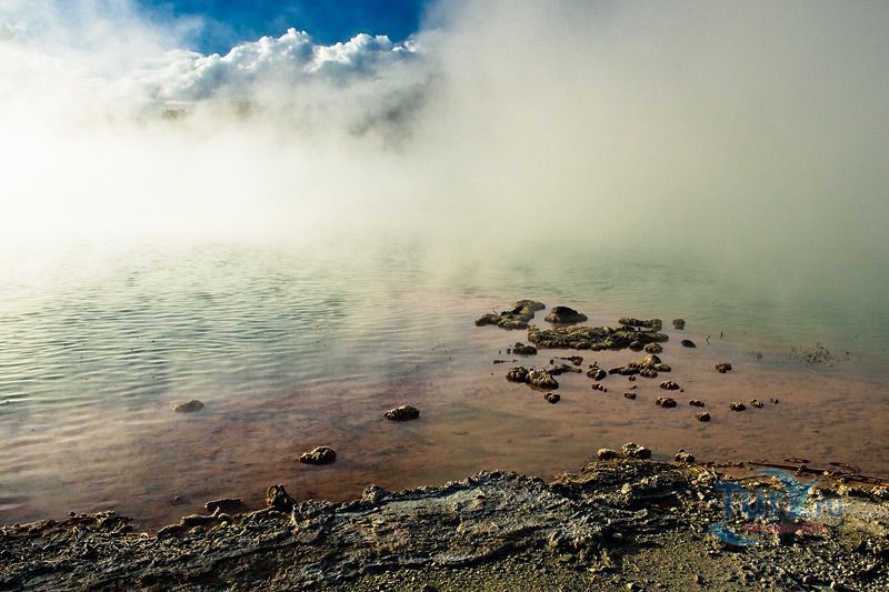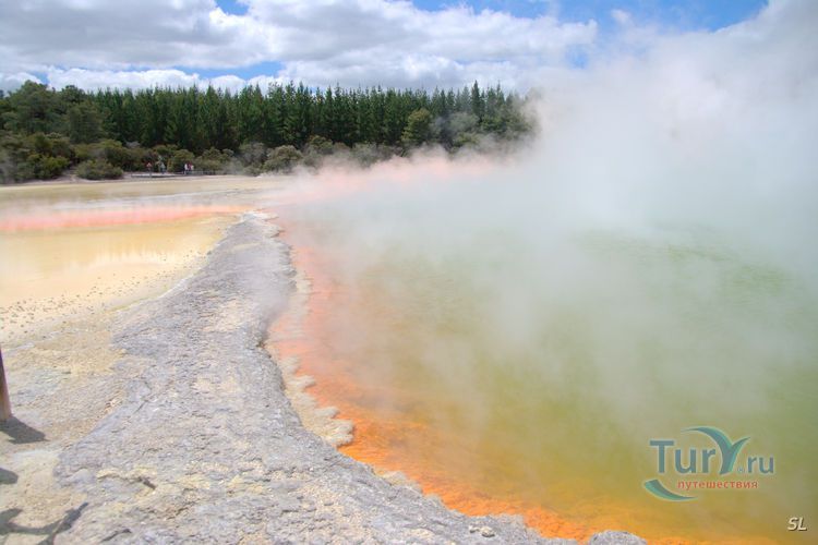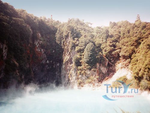 Примерно в 10 км. к юго-востоку от Роторуа, если ехать по Хайвею-5, находятся знаменитые голубое и зеленое озера Ваймангу - озера горячей воды в кратере потухшего вулкана. Вероятно, каждое озеро питается из собственного источника и вода на пути к поверхности похищает из пород разнообразные минеральные вещества, придающие ей те или иные оттенки. Окислы железа, входящие в состав окрестных пород, дают контрастный красный цвет, а встречающиеся здесь серные отложения придают желтый оттенок. На протяжении большей части XIX века знаменитые Белые и Розовые Террасы украшали Ваймангу, покрывая площадь более 5 гектаров. Ослепительные Белые Терассы походили на гигантскую мраморную лестницу. К сожалению, извержение в расположенных неподалеку горах Таравера 10 июня 1886 года уничтожило эту достопримечательность вместе с несколькими деревнями, похоронив их под огромной массой раскаленного пепла и обломков. Однако горячие источники в этой области продолжали бурлить, а в 1900 году появился новый гейзер Ваймангу. В то время это был самый мощный гейзер в мире, выбрасывавший взрывчатую смесь грязи, пара и воды на высоту 457 м. Через четыре года его мощь стала убывать, и в 1908 году гейзер пропал.