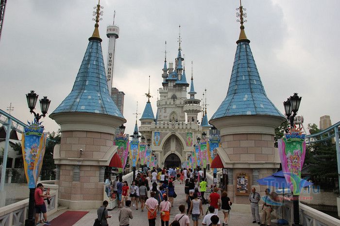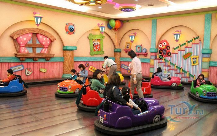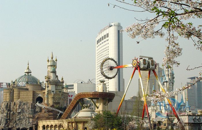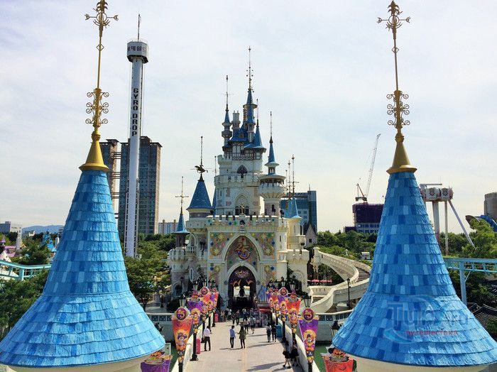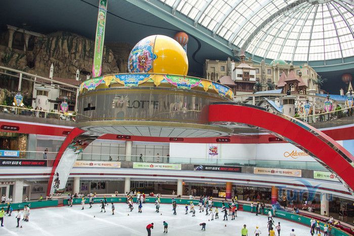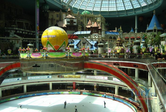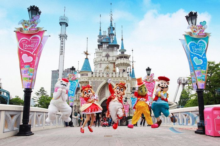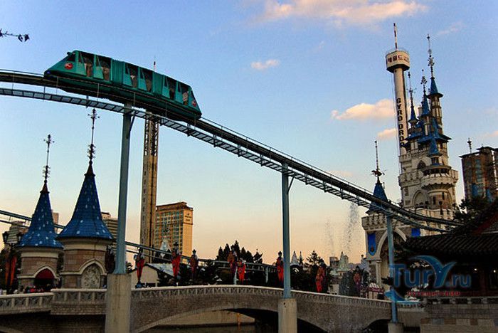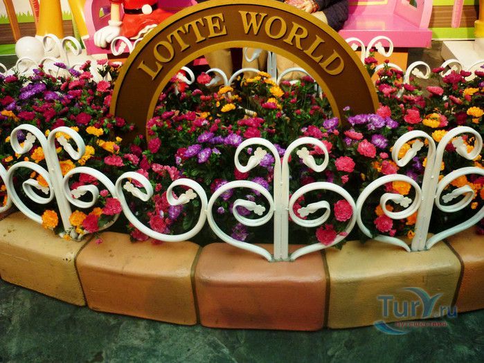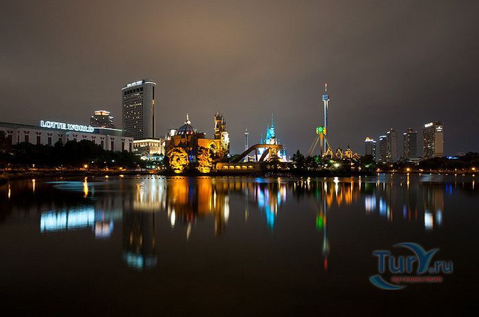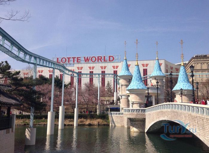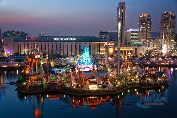 Развлекательный Комплекс Лотте Ворлд расположен в Южной Корее, в центре Сеула. Комплекс был открыт в 1989 году и с тех пор его ежегодно посещают более 6 миллионов человек. Лотте Ворлд делится на две части - крытый тематический парк Adventure и открытый парк развлечений Magic Island. Adventure является одним из крупнейших в мире крытых тематических парков, в нём расположены множество аттракционов, ледовый каток, этнографический музей, кинотеатр, роскошный отель, торговый и спортивный центры, магазины, рестораны и кафе. Здесь беспрерывно, сменяя друг друга, проводятся различные фестивали, карнавалы, лазерные шоу и театральные представления. Желающие могут прокатиться на воздушном шаре под самым куполом, совершить мёртвую петлю на американских горках, испытать свои нервы в комнате ужасов с оживающими мертвецами и горой скелетов, промчаться на джипе по доисторическим джунглям, отправиться в путешествие вместе с Синдбадом и даже побывать в плену у пиратов. Возле каждого экстремального аттракциона дежурят фотографы, любезно предлагающие участнику "полёта" купить на память его фото с перекошенным от страха лицом. Карусели, аттракционы, яркие огни и музыка - всё это движется, играет, сияет и мигает под аккомпанемент восторженных криков и смеха детей и взрослых. На нижнем этаже расположен ледовый каток, здесь же находятся служба проката коньков, раздевалки, спортивный магазин, бар и ресторан. Каток открыт круглый год и пользуется огромной популярностью у детей и влюблённых парочек. На третьем этаже расположен этнографический музей, экспозиция которого посвящена истории и культуре Кореи. Magic Island (Волшебный остров) - открытая часть комплекса, попасть сюда можно прямо из крытой зоны, перейдя по мосту. Волшебный остров расположен посреди озера, на нём находится сказочный замок и установлены высотные аттракционы, от катания на которых захватывает дух. Самые популярные из них - Чаиро-Дроп и Чаиро-Свинг, первый предлагает "упасть" с 70-метровой высоты, второй - попасть в центр воронки торнадо. Чтобы не искать после посещения Чаиро-Свинг свою обувь по всему парку, лучше перед катанием её снять. Посетители парка, устав от развлечений, могут прогуляться вокруг живописного озера, перекусить в одном из многочисленных кафе и обязательно попробовать мороженное, которым славится Лотте Ворлд.