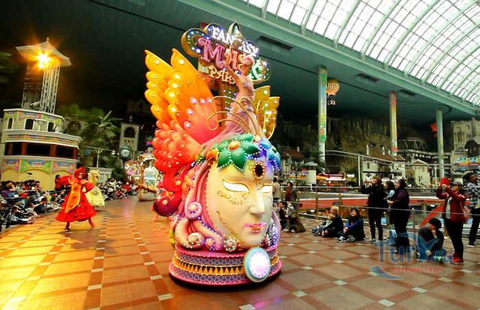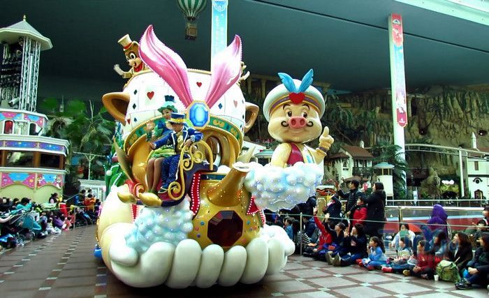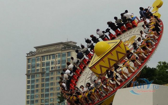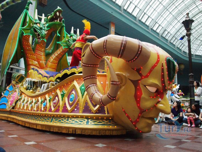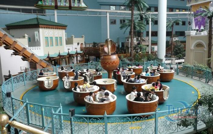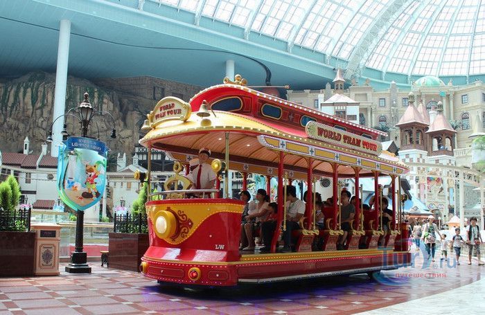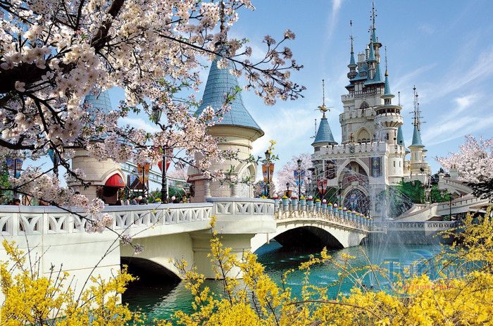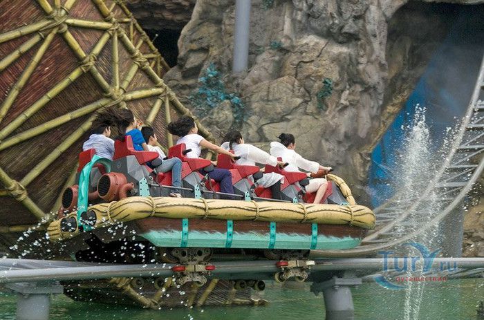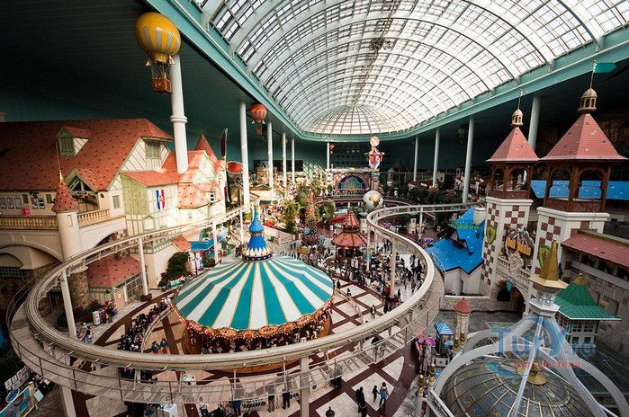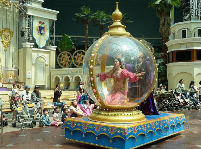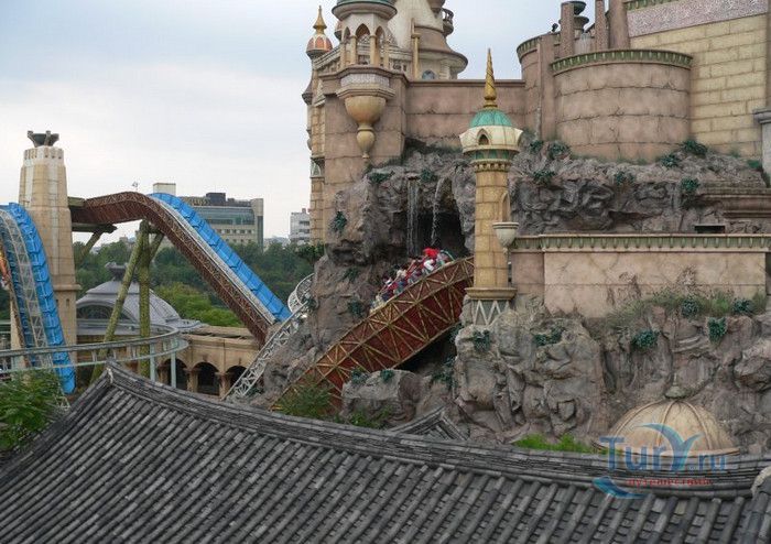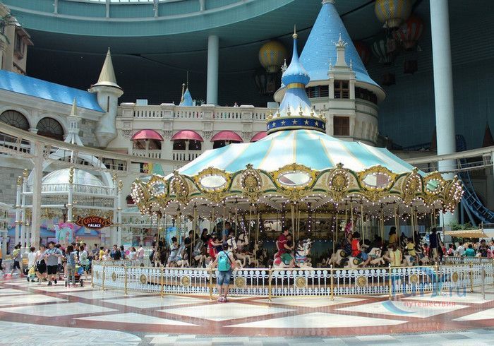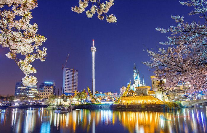 Развлекательный Комплекс Лотте Ворлд расположен в Южной Корее, в центре Сеула. Комплекс был открыт в 1989 году и с тех пор его ежегодно посещают более 6 миллионов человек. Лотте Ворлд делится на две части - крытый тематический парк Adventure и открытый парк развлечений Magic Island. Adventure является одним из крупнейших в мире крытых тематических парков, в нём расположены множество аттракционов, ледовый каток, этнографический музей, кинотеатр, роскошный отель, торговый и спортивный центры, магазины, рестораны и кафе. Здесь беспрерывно, сменяя друг друга, проводятся различные фестивали, карнавалы, лазерные шоу и театральные представления. Желающие могут прокатиться на воздушном шаре под самым куполом, совершить мёртвую петлю на американских горках, испытать свои нервы в комнате ужасов с оживающими мертвецами и горой скелетов, промчаться на джипе по доисторическим джунглям, отправиться в путешествие вместе с Синдбадом и даже побывать в плену у пиратов. Возле каждого экстремального аттракциона дежурят фотографы, любезно предлагающие участнику "полёта" купить на память его фото с перекошенным от страха лицом. Карусели, аттракционы, яркие огни и музыка - всё это движется, играет, сияет и мигает под аккомпанемент восторженных криков и смеха детей и взрослых. На нижнем этаже расположен ледовый каток, здесь же находятся служба проката коньков, раздевалки, спортивный магазин, бар и ресторан. Каток открыт круглый год и пользуется огромной популярностью у детей и влюблённых парочек. На третьем этаже расположен этнографический музей, экспозиция которого посвящена истории и культуре Кореи. Magic Island (Волшебный остров) - открытая часть комплекса, попасть сюда можно прямо из крытой зоны, перейдя по мосту. Волшебный остров расположен посреди озера, на нём находится сказочный замок и установлены высотные аттракционы, от катания на которых захватывает дух. Самые популярные из них - Чаиро-Дроп и Чаиро-Свинг, первый предлагает "упасть" с 70-метровой высоты, второй - попасть в центр воронки торнадо. Чтобы не искать после посещения Чаиро-Свинг свою обувь по всему парку, лучше перед катанием её снять. Посетители парка, устав от развлечений, могут прогуляться вокруг живописного озера, перекусить в одном из многочисленных кафе и обязательно попробовать мороженное, которым славится Лотте Ворлд.