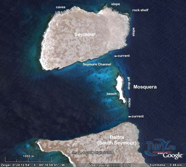 Маленький песчаный остров Москуэра (Mosquera) расположен в канале между островами Балтра (Isla Baltra) и Сеймур (Isla Seymou) и имеет размеры rприблизительно 120 на 600 метров.