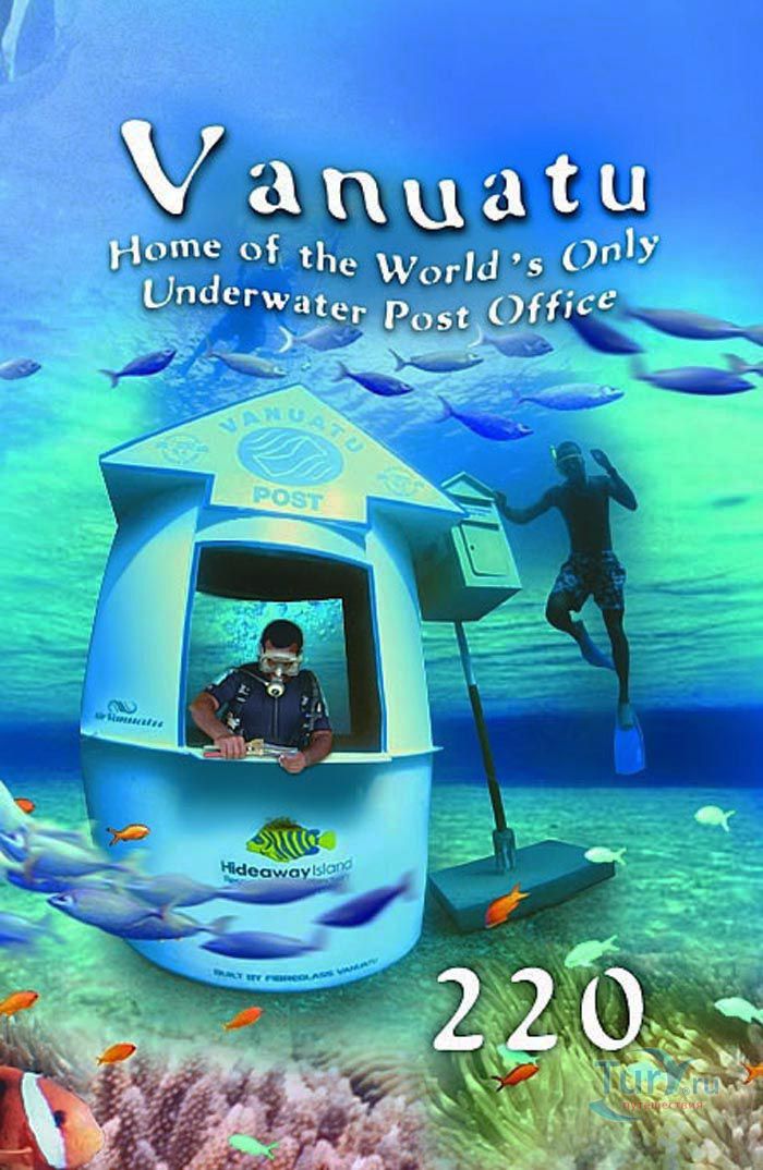 Почта Вануату призывает туристов смотреть буквально ниже поверхности этой прекрасной страны и захватить маску, трубку и ласты, чтобы посетить подводное почтовое отделение. Они гарантируют вам открытия неограниченных удовольствий и незабываемых приключений!