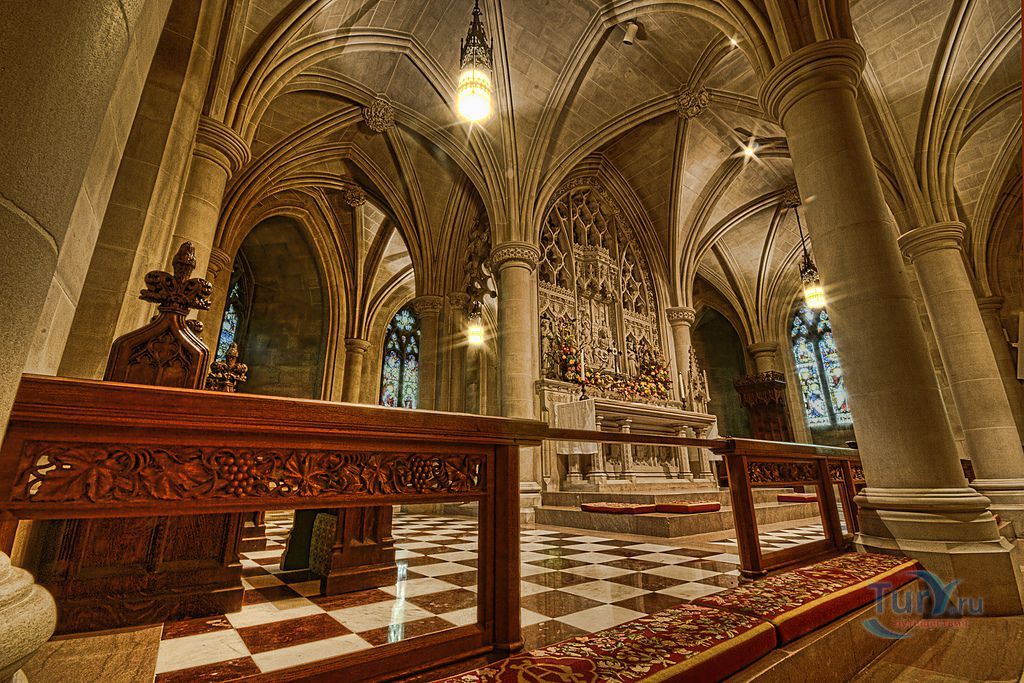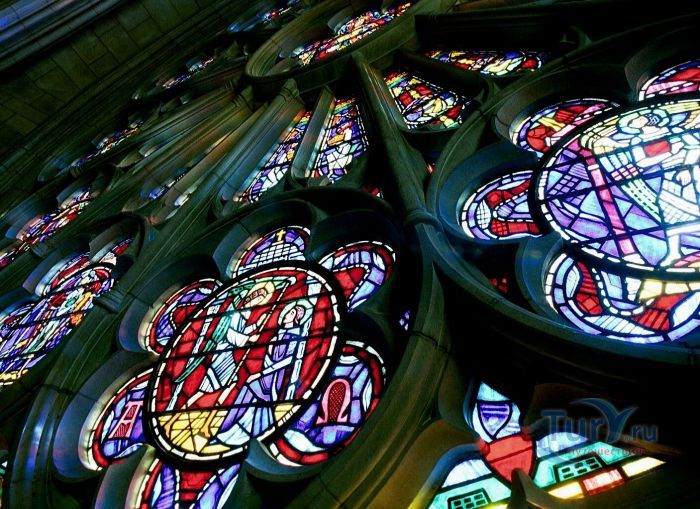 Высеченная из камня кафедра была подарена англиканской церковью. Западное розовое окно состоит из 10500 кусков цветного стекла и отбрасывает на пол чудесные солнечные блики. А космическое окно выделяется тем, что в его свод инкрустирован лунный камень.