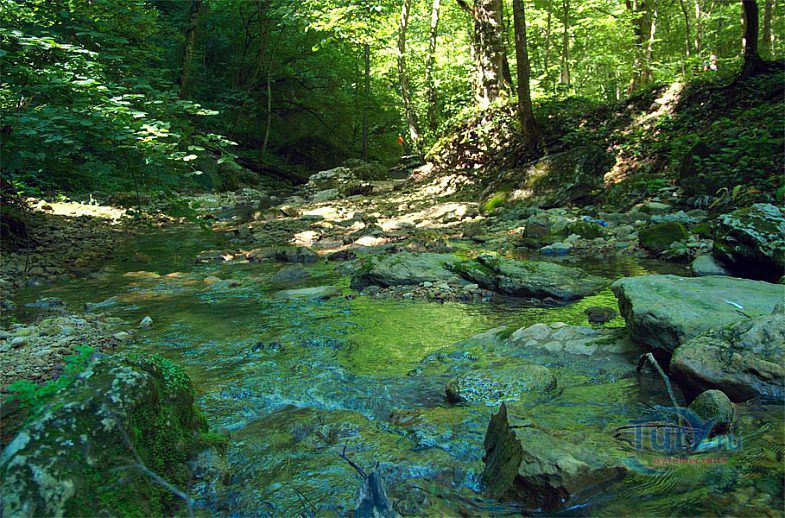 Путь к ущелью Мешоко - "Медвежья долина" начинается от заброшенного карьера по добыче камня-известняка. Здесь огромный многоярусный разрез монолитной скалы. На самом дне глубокого воронкообразного карьера образовалось родниковое озеро. Озеро назвали Красным за его розовый отблеск, идущий от скалы. Через десять минут ходьбы от окраины посёлка туристы попадают к впадению реки Мешоко в Белую. Хребет Уна-Коз в этом месте разрезан глубоким ущельем. От небольшого соснового бора тропинка поднимается круто вверх под отвесные скалы и выходит к большому гроту. За поворотом скалы на небольшой террасе - капельный родник. Он наполняет живительной влагой выдолбленную в скале чашу.