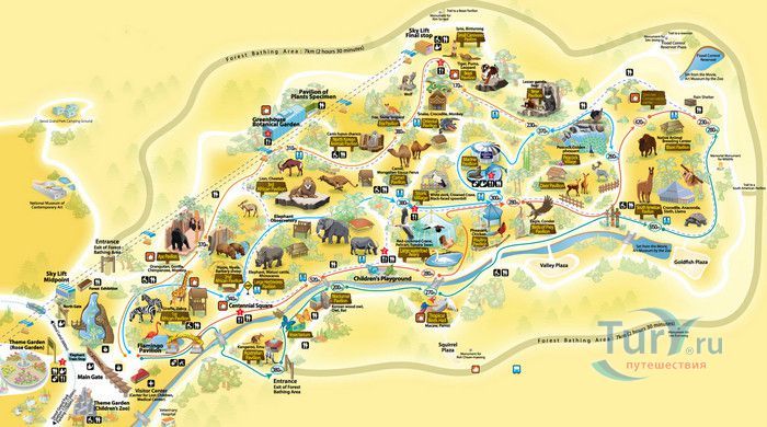 Сеульский Зоопарк расположен Южной Корее, в городе Квачхон, в часе езды от Сеула. Зоопарк, в составе Большого Сеульского Парка, открыл свои двери посетителям 1 мая 1984 года, занимает территорию площадью 2420 квадратных километров и служит домом для 2700 животных, представляющих 332 вида. Сеульский зоопарк - один из самых больших в мире, он делится на несколько тематических зон - обитатели Африки, Азии, Америки, хищники, экзотические животные и птицы, а также павильон насекомых. Здесь можно посмотреть на львов, тигров, слонов, бегемотов, жирафов, зебр, антилоп, бизонов, обезьян, лемуров, тюленей, выдр, хищных и водоплавающих птиц. Животные живут в просторных вольерах, отгороженных от посетителей глубокими рвами или высокими заборами. Огромной популярностью, особенно у детей, пользуются сеансы кормления животных. Посетители могут угостить лакомствами слона и мартышку, кроликов и овец, посмотреть, как проходит процесс кормления львов и тигров, медведей и жирафов. В зоопарке для посетителей разработаны 4 маршрута протяжённостью от 1,5 до 1,8 км - Дороги Тигра, Дельфина, Оленя и Совы. По зоопарку также можно проехаться на туристическом "трамвайчике" или по канатной дороге, наблюдая с высоты птичьего полёта за жизнью животных. Окруженный горами Чонгёсан, зоопарк полностью защищён от суеты и шума города и является отличным местом отдыха для взрослых и детей - здесь много деревьев и лужаек, есть детская игровая площадка, многочисленные кафе и ресторанчики. Сеульский зоопарк ежегодно посещают около 3,5 миллионов человек.