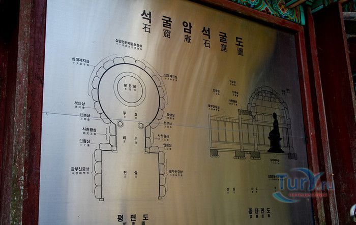 Грот Соккурам - рукотворный буддийский пещерный храм, часть храмового комплекса Пульгукса и одна из самых известных достопримечательностей Южной Кореи. Храм расположен на территории Национального парка Кёнджу, на восточном склоне горы Тохамсан, на высоте 750 метров над уровнем моря. Его возведение было начато по инициативе Ким Дэ Сона, премьер-министра государства Силла во время правления короля Гёндоке. Строительство храма, который изначально носил название Сокпульса (Храм каменного Будды), было начато в 751 году, завершено в 774 году, уже после смерти его основателя. Грот был задуман как дополнение к храму Пульгукса и символизировал путешествие души в Нирвану. Пещерный храм построен из гранита, состоит из арочный входа, который ведёт в небольшой квадратный аванзал, длинного коридора, украшенного барельефами, и главного купольного зала в форме ротонды. Для строительства куполообразного потолка центрального зала и коридора были использованы 360 каменных плит. В центре зала установлена 3,5-метровая статуя Будды Шакьямуни, сидящего на полутораметровом пьедестале в форме цветка лотоса. Стены храма украшены барельефами и статуями бодхисаттв, архатов, хранителей четырёх сторон света, хранителей врат, небесных воевод и индуистских богов. Куполообразный потолок оформлен полумесяцами и цветами лотоса. Долгие годы забвения и высокая влажность нанесли большой урон храму. Первые попытки реконструировать святилище были предприняты в 1703 и 1758 годах, во время правления династии Чосон. Масштабная реконструкция грота Соккурам была проведена лишь в 60-х годах XX столетия, в ходе которой минимизировано разрушающее воздействие влаги, а статуя Будды ограждена стеклянной перегородкой. Пещерный храм Соккурам - одно из самых красивых буддийских святилищ Будды в мире, религиозный и архитектурный памятник государства Силла, Национальное сокровище Южной Кореи № 24, в 1995 году внесен в список Всемирного наследия ЮНЕСКО.