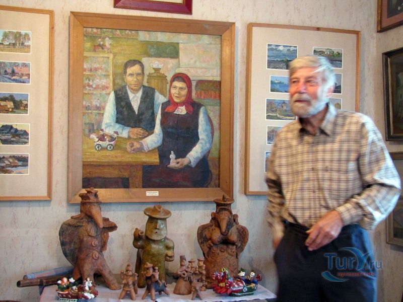 Этот необычный каргопольский музей открыт в старом бревенчатом доме с зелеными наличниками. Именно в нем, в двух небольших комнатах, жили в Каргополе потомственные мастера-игрушечники Дмитрий Васильевич и Клавдия Петровна Шевелевы, растили детей - будущих каргопольских художников Валентина, Виталия и Владимира, воспитывали внуков, которые не забывают ремесло предков. Здесь часто бывал старший брат Клавдии Петровны, Александр Петрович, именно он, автор каргопольской «Тройки», создал в Каргополе в 1967 году цех по изготовлению глиняной игрушки и посуды – филиал Архангельского предприятия «Беломорские узоры».