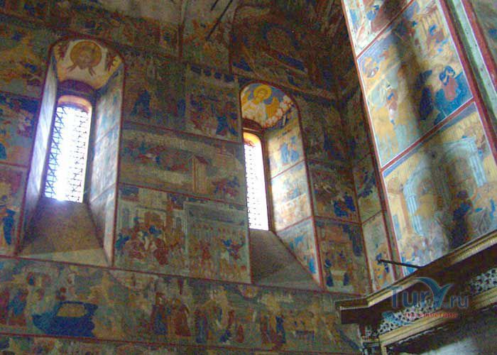 Церковь Иоанна Предтечи в Ярославле строилась с 1671 по 1687 год в Толчковской слободе, на правом берегу реки Которосли. Роспись велась в 1694-1695 годах артелью ярославских живописцев во главе с Дмитрием Плехановым и Фёдором Игнатьевым. Пятнадцать глав церкви разбиты на три группы. Церковь Иоанна Предтечи уникальный памятник архитектуры и древнерусской живописи. Это последний шедевр знаменующий собой апогей в развитии ярославской архитектурной школы. Небольшой комплекс состоит из церкви Иоанна Предтечи, колокольни и Святых ворот. С алтарной стороны галереи замыкают равные по высоте основного здания приделы, увенчанные малыми пятиглавиями. Этот новаторский приём, соединивший в одну композицию три пятиглавых группы, принёс памятнику мировую известность. Необыкновенно живописный силуэт церкви поражает разнообразием перспектив и соотношением объёмов. Его дополняет 45 метровая, отдельно стоящая, многоярусная колокольня построена в 1690 году. Декоративное убранство храма невероятно насыщено - кирпичные узоры, красочные изразцы, росписи апсид, дверей и ставен всё это создаёт образ фантастического, неземного сооружения.