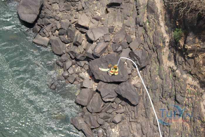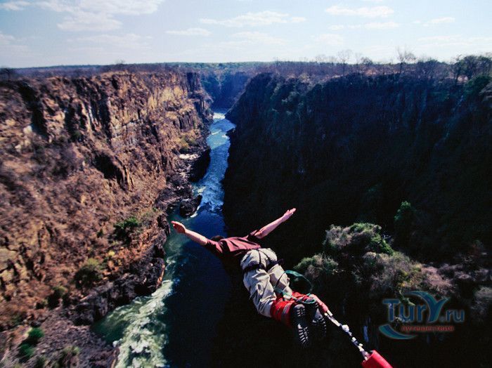 Железнодорожный мост у водопада Виктория на реке Замбези, соединяющий Замбию и Зимбабве, расположен чуть ниже водопада Виктория. Мост сам по себе является популярной достопримечательностью, которую посещают тысячи туристов, с него открывается великолепный вид на водопад Виктория и реку Замбези. Кроме того, мост привлекает любителей острых ощущений возможностью совершить головокружительный прыжок банджи с высоты 111 метров, зависнув буквально в нескольких метрах от порогов на реке Замбези. Интересно, что банджи-джампинг зародился именно на просторах Африки - у некоторых африканских племён существует старинный ритуал, когда мужчины взбираются на 30-метровую вышку, обвязывают ноги лианами и прыгают вниз. Особенность этого прыжка в том, что голова должна коснуться земли, а смысл ритуала - уберечь племя от неурожая. После того, как новозеландец Эй Джей Хаккетт впервые прыгнул вниз головой с привязанным к ногам эластичным канатом, банджи-джампинг стал массовым экстремальным увлечением во всем мире. Многие любители пощекотать нервы утверждают, что прыжок с моста у водопада Виктория - лучший прыжок банджи в мире. Кроме того, есть возможность прокатиться над ущельем по 135-метровому канату, натянутому на высоте 75 метров, или испытать "качели моста", спрыгнув с разбега прямо в пропасть и на протяжении 50 метров пребывать в свободном полёте. Естественно, прыжок совершается с надежно закреплённым за спиной эластичным канатом, прыгать можно как одному, так и в тандеме. По желанию, можно заказать съёмку своего полёта над бездной.