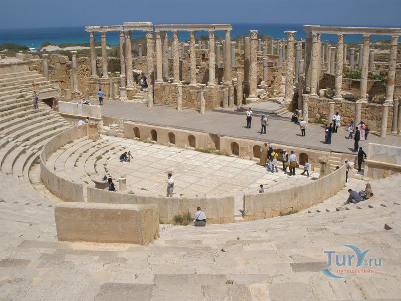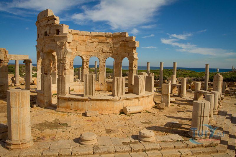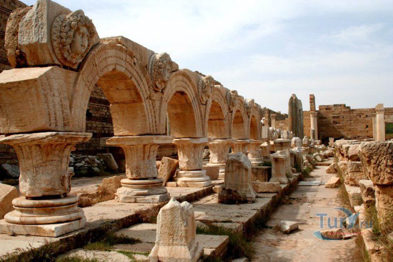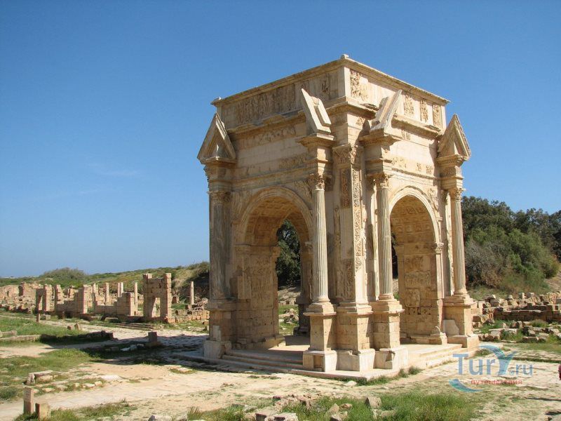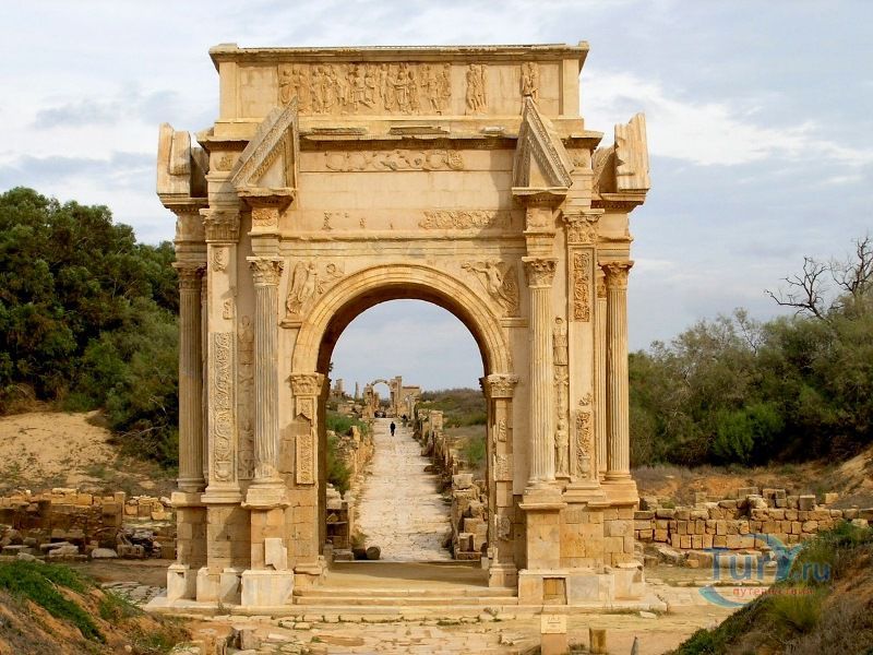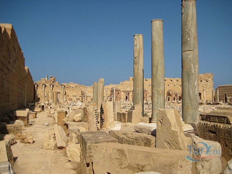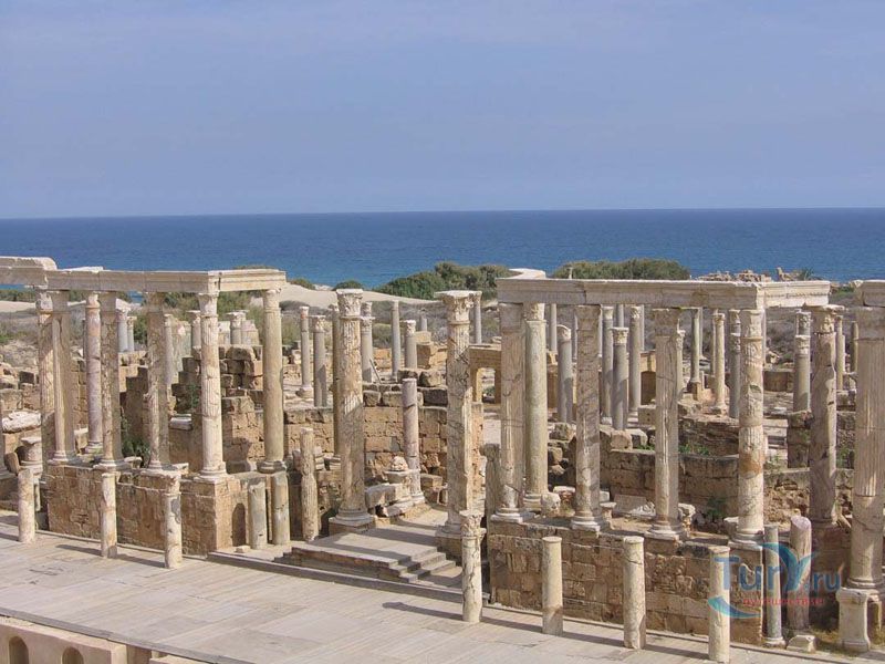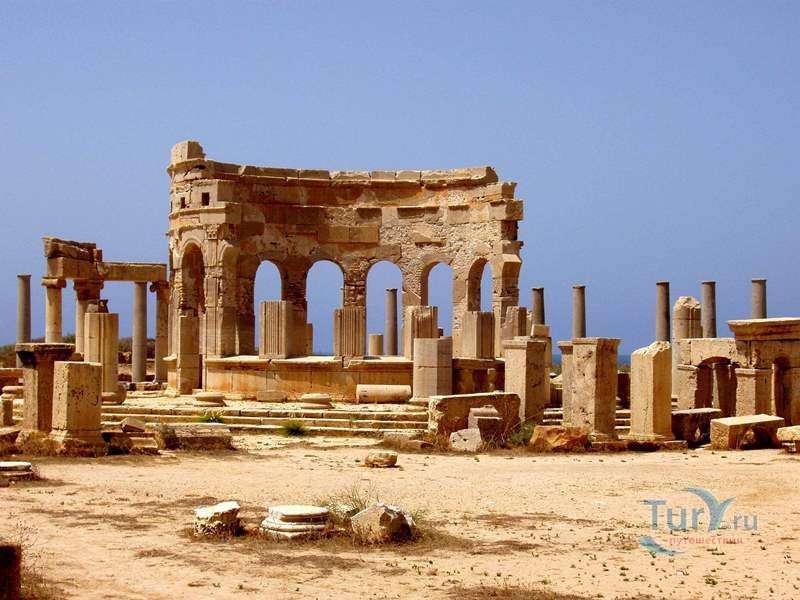 Лептис Магна - превосходно сохранившийся римский город у устья реки Вади Лебда в 120 км к востоку от Триполи. В давние времена был промежуточным портом на торговом пути финикийцев в этой части континента, а к VI веку до н. э. управлялся Карфагеном. Среди самого привлекательного - Триумфальная Арка Септима Севра, Форум, Базилика с её орнаментальными начертаниями и многочисленными скульптурами, полукруглый Нимфеум и Термы Адриана. Изящная улица с колоннами соединяет Термы с бухтой. Впечатляет 70-метровый в диаметре амфитеатр, с которого открывается вид на город во все направления. Римский Круг, на восточной стороне города, построен в форме подковы и точно повторяет линию побережья. Толомея (Птоломея) - изысканно украшенный Эллинский Дворец является основной достопримечательностью этого древнего города. Постройка относится к I веку до н. э. с более поздними, I века н.э., пристройками. Улица Памятников, идущая с юго-запада на северо-восток через северный район, была главной артерией города и поэтому на всём своём протяжении украшена фонтанами, портиками, гравюрами и скульптурами. Сирена - Храм Аполлона, одно из самых древних зданий города, воздвигнутое в VII веке до н.э. с более поздними пристройками и с надписями имен римских священников по обеим сторонам входа. У главного алтаря при входе - дренажное приспособление, по которому стекала кровь жертвенных животных. Фонтан Аполлона расположен сразу за Храмом. Тут же, предположительно императором Трояном в 98 г. н.э. были построены Великие Термы, но после того, как они были разрушены во время Еврейского погрома, в 119 г. н.э. их восстановил император Андриан. Здание интересно своими изысканными украшениями, мраморными стенами и полами, мозаиками и удивительными сводами крыши. Капитолий, построенный уже в конце Эллинского периода, был превращен римлянами в храм, где молились Юпитеру, Юноне и Минерве. По сторонам улицы Кариатид, идущей в восточном направлении от Агоры, когда-то располагалось множество скульптур на пьедесталах. Сейчас они валяются на земле и безвозвратно разрушаются. На самой улице расположен изящный дом Ясона Магнуса - одного из священников храма Аполлона. В пределах городских стен расположены Театр, Бани, Главная улица и развалины Византийского Дворца. Вокруг - многочисленные церкви: Церковь Двойных Стен, Восточная Церковь V века н. э. с колоннами из зеленого мрамора, Центральная Церковь и Западная Церковь. В центре старого города - музей, в котором выставлены некоторые Византийские мозаики и скульптуры.