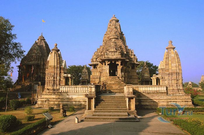 Группа храмов в Кхаджурахо, объект Всемирного наследия ЮНЕСКО, - великолепный образец искусства и храмовой архитектуры средневековой Индии. Комплекс храмов расположен в индийском штате Мадхья-Прадеш, в небольшом городке Кхаджурахо. Храмы были построены в 950 - 1050 годах, во время правления в Центральной Индии могущественной династии Чандела. Кхаджурахо считался культурной и религиозной столицей государства, в течение 100 лет в городе были возведены 85 храмов, до наших дней сохранились лишь 22. После заката династии Чандела в XIII веке Кхаджурахо словно исчез с лица земли, а величественный храмовый комплекс поглотили джунгли. Лишь в 1838 году Кхаджурахо был вновь открыт британским военным инженером Бертом, исследовавшим эту местность. Храмы Кхаджурахо построены рядом друг с другом, но представляют две различные религии - брахманизм (ранняя форма индуизма) и джайнизм, символизируя традицию принятия и уважения различных религиозных взглядов среди индусов и джайнов. Комплекс делится на три зоны - западную, восточную и южную. Наиболее представительная и хорошо сохранившаяся - западная группа (храмы Лакшмана, Варахи, Лакшми, Кандария-Махадевы, Джагадамби, Читрагупта (бога Солнца), Висванатха и святилище Нанди). Ближе к озеру расположена восточная группа (индуистские храмы Брахмы, Ваманы и Джавари и три джайнистских храма Гхантай, Адинатха и Паршванатха). Южная группа состоит из двух храмов - Дуладео и Чатурбхуджа. Храмы выполнены из гранита и песчаника, при строительстве не использовались какие-либо растворы, блоки укладывались один на другой и соединялись при помощи пазов и выступов. Каждый храм стоит на высокой каменной платформе-террасе и ориентирован по сторонам света. По периметру платформы и над центральным святилищем высятся высокие пирамидальные башни-шикхары. Их "нагромождение" создаёт иллюзию горной гряды Западного Тибета и священной горы Кайлас - обители Шивы и других богов. Шикхары и стены храмов украшены множеством барельефов и скульптур, изображающих сцены повседневной жизни, войны, ритуальные процессии и эротические сцены. Несмотря на то, что храмы Кхаджурахо получили мировую известность благодаря изображениям сцен плотской любви, на самом деле их доля не превышает 10% всех рельефов. Каджурахо можно назвать своеобразной каменной энциклопедий средневекового индийского общества и учения Тантры. В знаменитом романе Ивана Ефремова "Лезвие бритвы" описанию храмов посвящено немало восторженных слов: "Необъяснимое волнение охватило художника при виде высоких сикхар - башен над святилищами, собравшихся группами на фоне голубых столообразных гор в запыленном мареве горячего воздуха, плававшего над серой равниной" и "Можно показать женщину совершенно обнаженной и в то же время кристально чистой и благородно прекрасной. Можно изобразить страсть так, что в ней не будет ничего аморального, да посмотрите вы как следует на те же скульптуры Кхаджурахо".