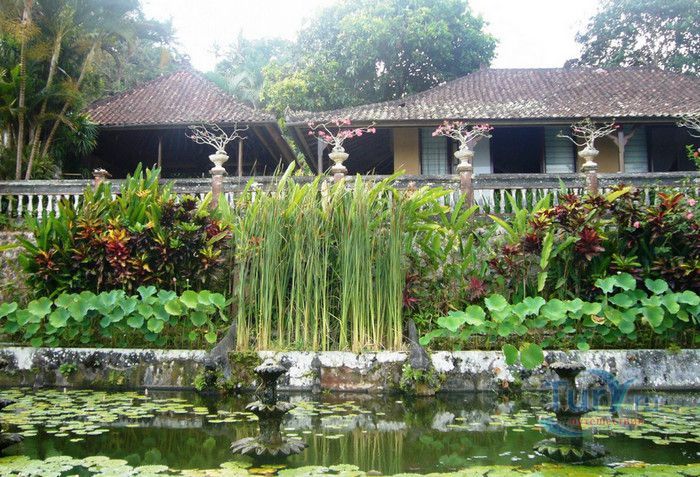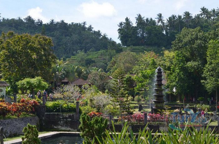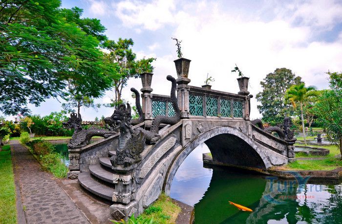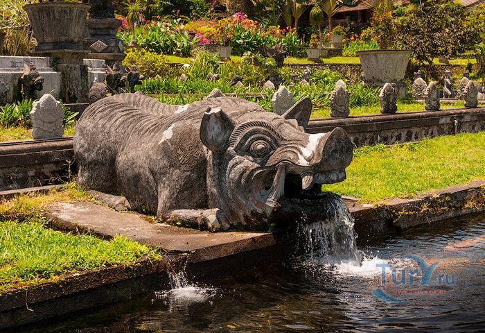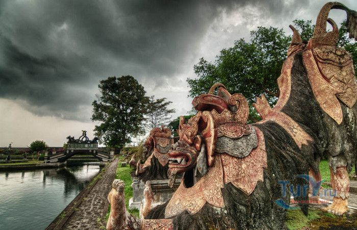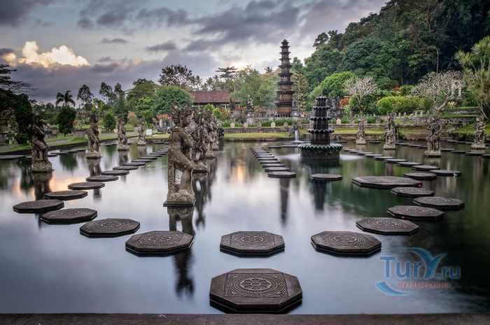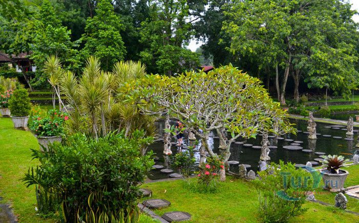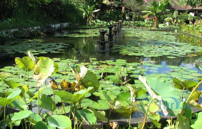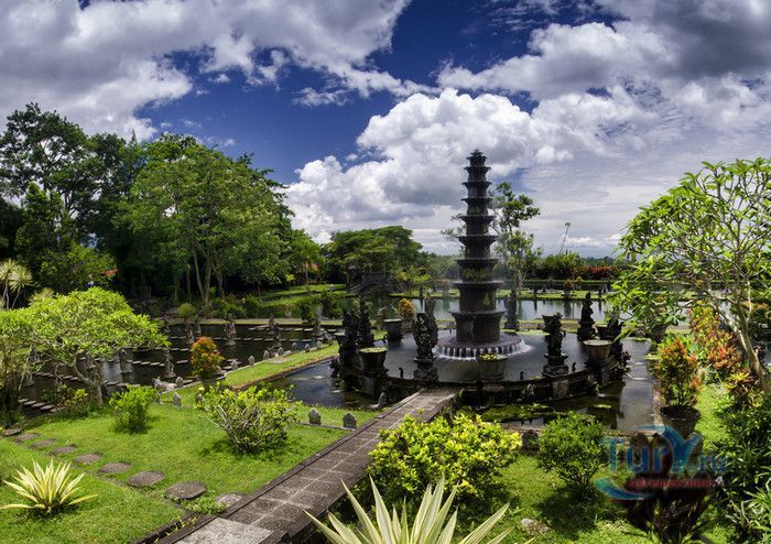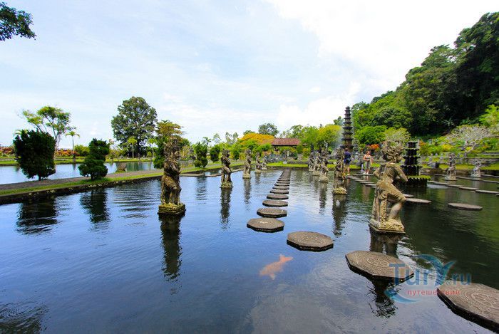 Водный Дворец Тирта Ганга расположен в Индонезии, в восточном Бали, в регентстве Карангасем. Раджа Карангасема Анак Агунг Англурах Кетут построил дворец в 1946 году для своей семьи и посвятил его священным водам Ганга. В 1963 году, из-за извержения вулкана Агунг, Тирта Ганга был полностью разрушен, королевская семья вынуждена была покинуть его. Водный дворец был восстановлен потомками раджи в 1979 году и ныне предстаёт перед посетителями в своём былом великолепии. Дворцово-парковый комплекс занимает территорию площадью 1,2 гектара. Вокруг дворца раскинулся пышный тропический сад с бассейнами, прудами, фонтанами, купальнями, каменными мостиками и статуями. Водный дворец разделён на три уровня, верхний уровень символизирует мир богов, средний - мир людей, а нижний - мир демонов. На нижнем уровне находится большой пруд со статуями и круглыми ступенями, "лежащими" на воде, по ним можно прогуляться и понаблюдать за карпами кои, населяющими водоём. Следом расположен бассейн с 10-метровым фонтаном, одиннадцать уровней которого выполнены в виде цветов лотоса. Основание фонтана украшено каменными скульптурами. Под старым деревом баньяна находится источник, вода которого считается священной, она используется во время религиозных церемоний, а также в качестве источника питьевой воды. Купание в бассейне со священной водой, по существующему поверью, дарует молодость, здоровье и благословение богов. Средний уровень содержит несколько прудов и бассейнов, на верхнем находятся королевская резиденция, гостевые бунгало и ресторан. Посетители могут прогуляться по тропинкам парка, отдохнуть в тени деревьев или у фонтанов, отведать национальную кухню в ресторане и, при желании, остаться на ночь в одном из отелей, построенных рядом с водным дворцом Тирта Ганга.