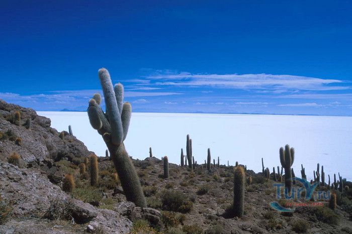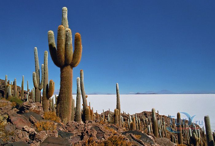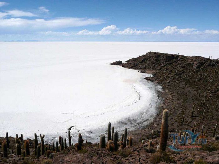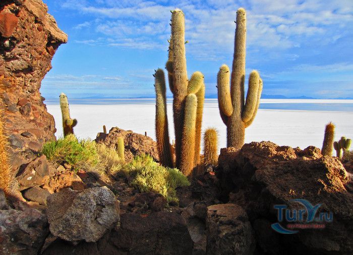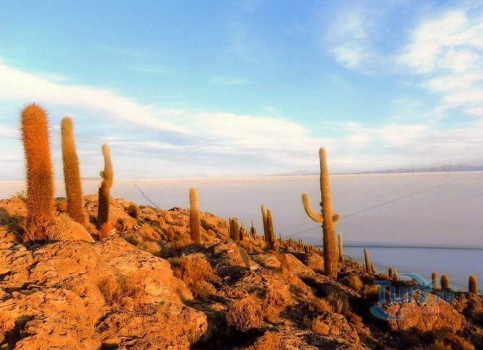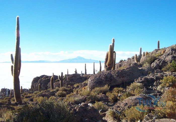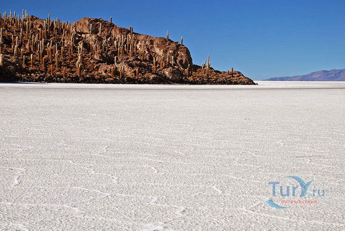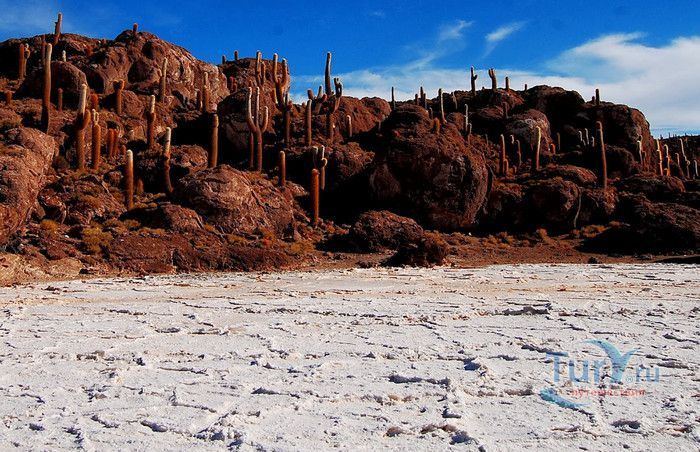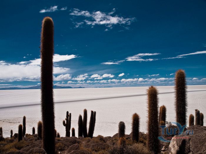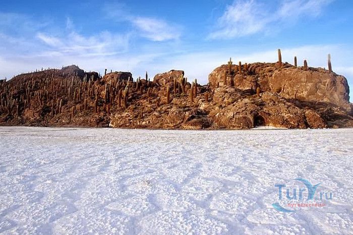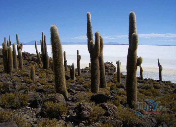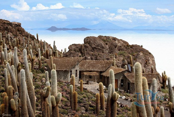 Остров Рыбы - не совсем остров, здесь нет воды и рыба не водится. Это своеобразный каменистый оазис, расположенный в северной части соляной пустыни Салар-де-Уюни, в Боливии. Название острову дали индейцы аймара из-за его формы. В сезон дождей, когда солончак, окружающий со всех сторон остров, покрывается слоем воды, отражение острова в соляном озере напоминает своими очертаниями гигантскую рыбу. А стремительно несущиеся по небу облака, отражаясь в водном зеркале, создают визуальный эффект волн на море. На каменистой почве острова растёт "кактусовый лес", гигантские растения могут вырастать до 10 метров в высоту. На острове живут несколько семей, из живности - только ламы, которых разводят местные жители. Туристическая инфраструктура не развита, добраться до острова достаточно сложно, в случае предполагаемой ночёвки, необходимо заранее согласовать вопрос с туроператором. Остров Рыбы не так известен, как расположенный в 20 км от него остров Инкауаси, но с каждым годом посмотреть на это чудо природы приезжают всё больше туристов.