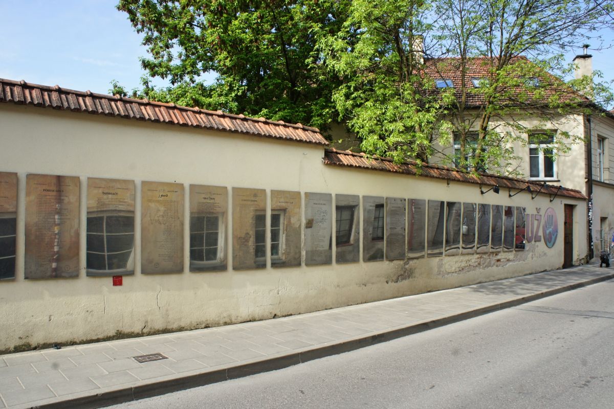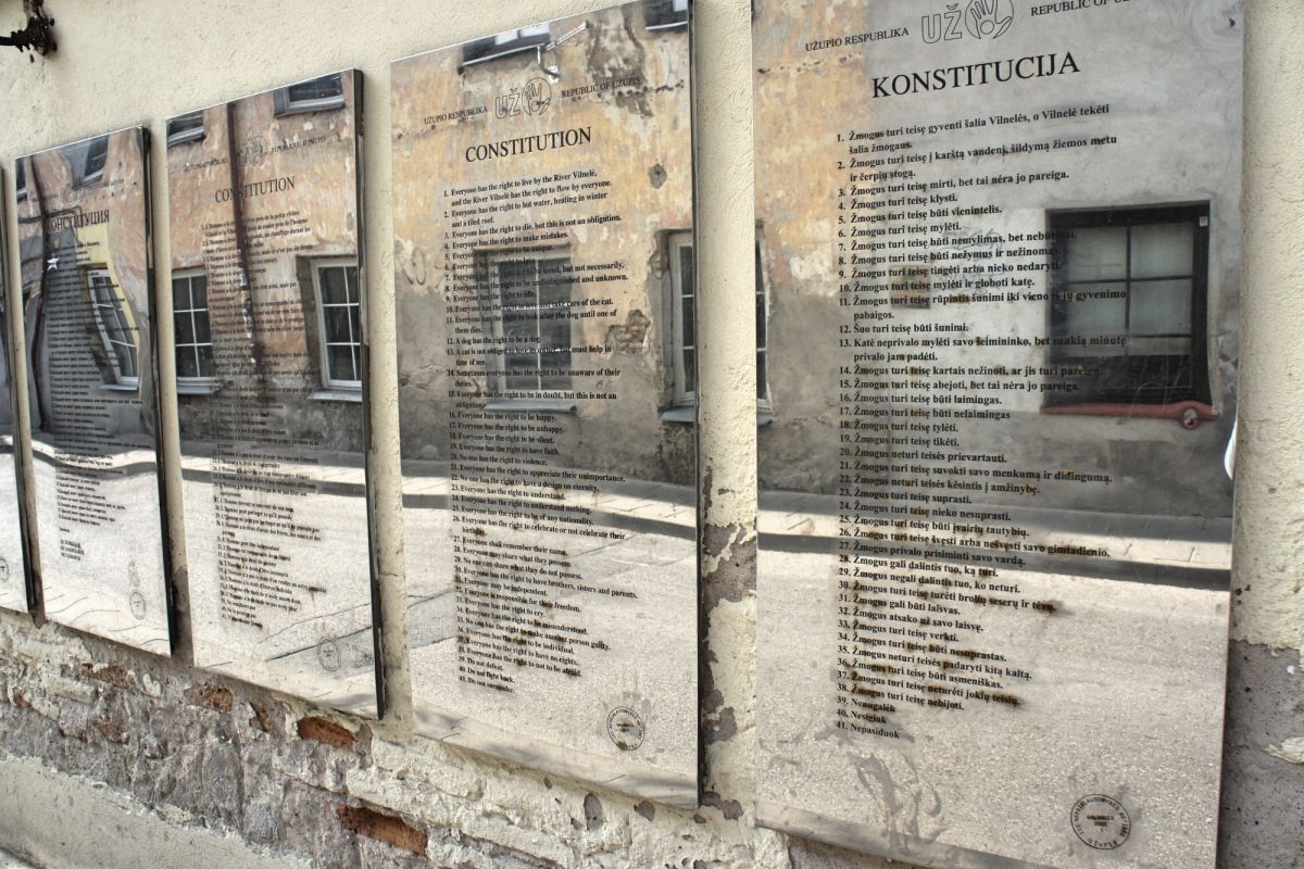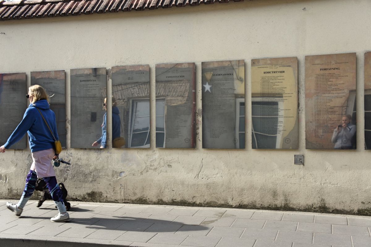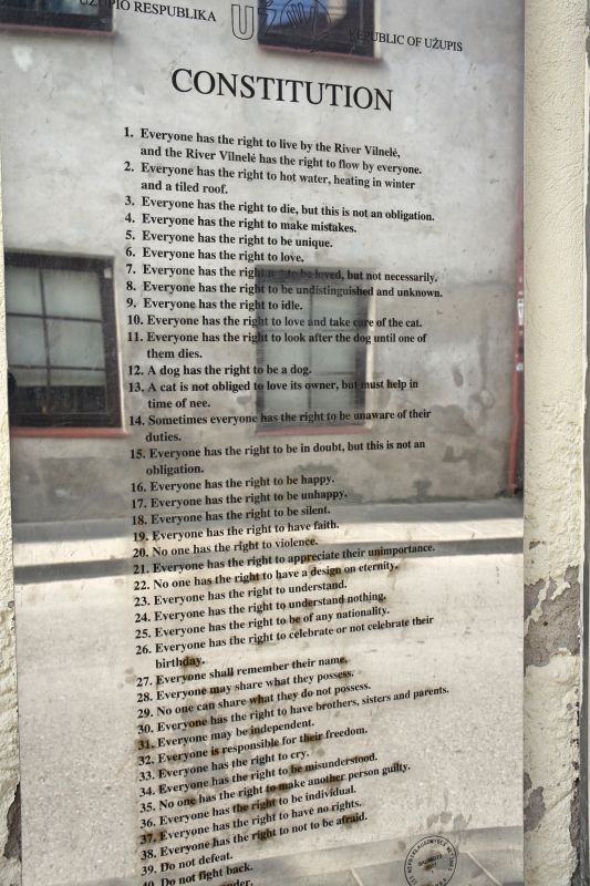 Хорошо отображает характер этого необычного места - Конституция Республики Ужупис, которая выбита на стальных табличках, в количестве 41 штуки (соответствующих 41 языку мира) и содержит 41 тезис, которые я осмелюсь привести здесь в полном объёме ввиду их исключительного своеобразия: