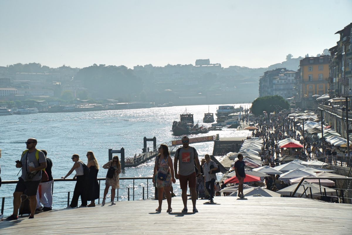 На рисковую забаву праздно взирает многочисленный люд, толпящийся на Набережной Рибейры - туристы со всех концов света и торговцы всех мастей. Кафешки, кофейни, сувенирные лавки, кондитеры и мороженщики застолбили свои теплые места под тенистыми зонтами - сквозь них золотоносной жилой течет нескончаемый людской поток.