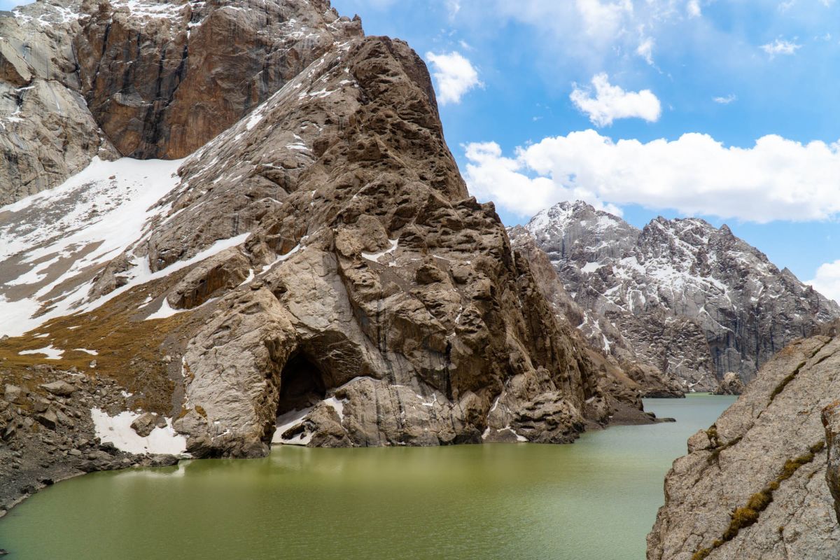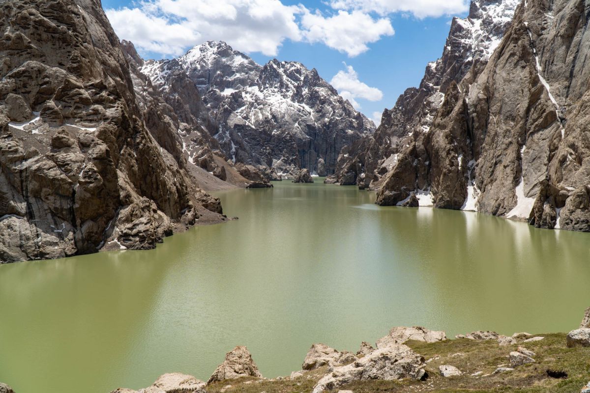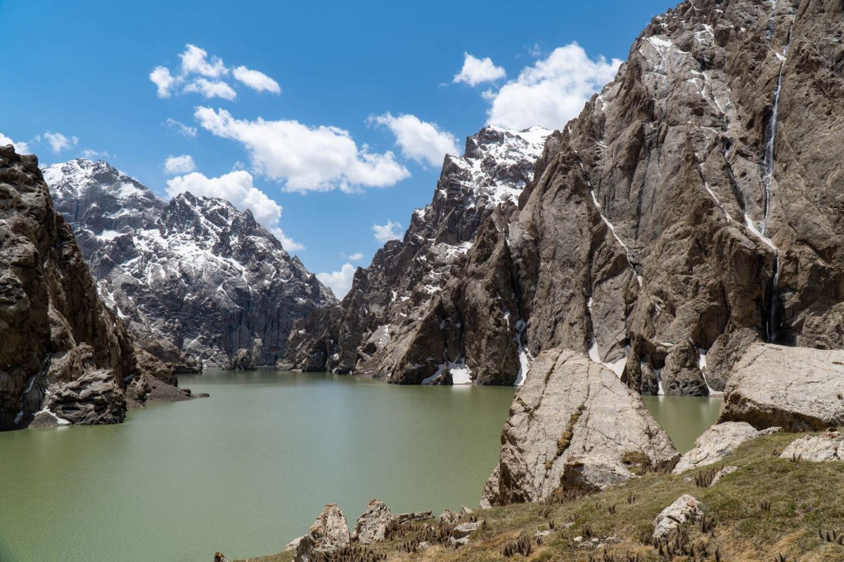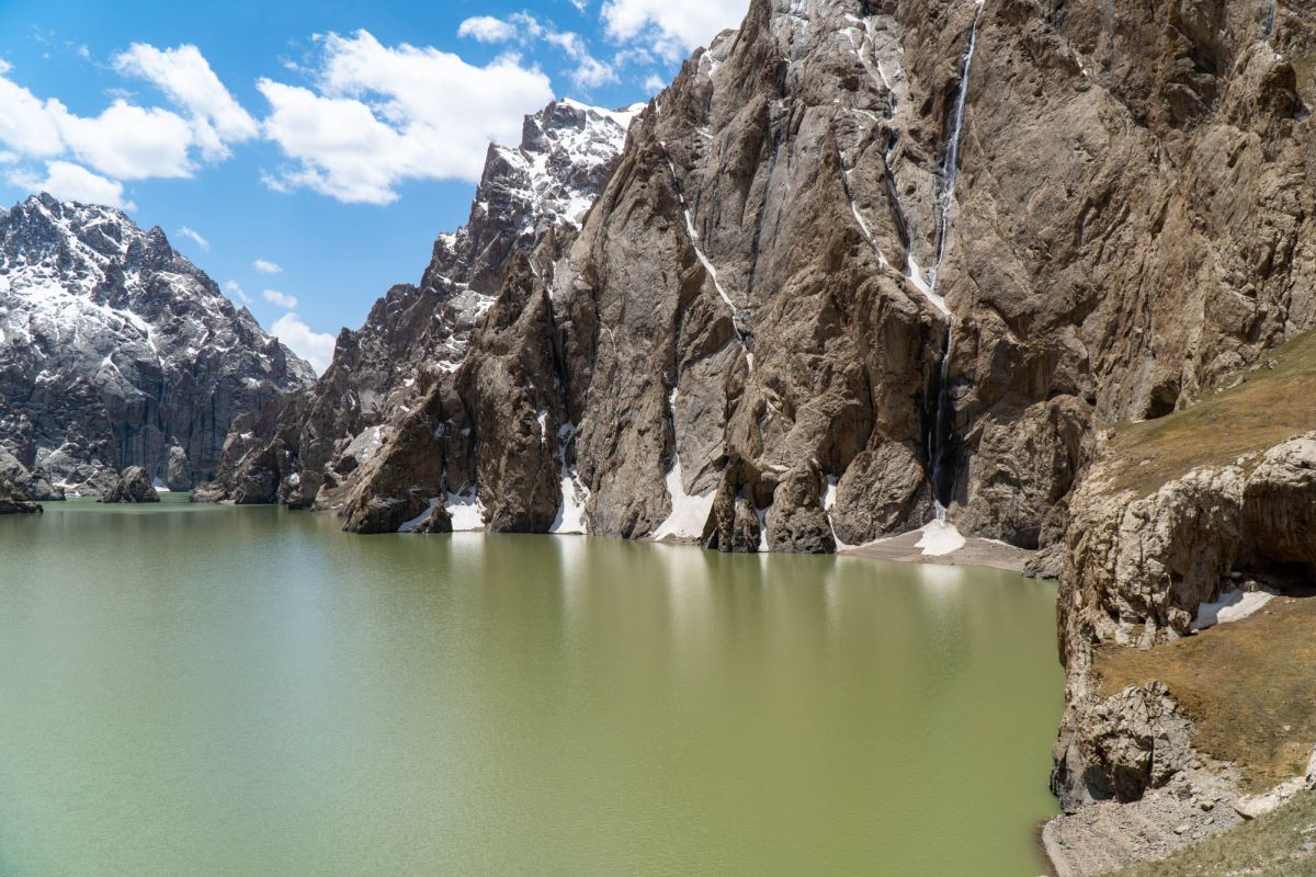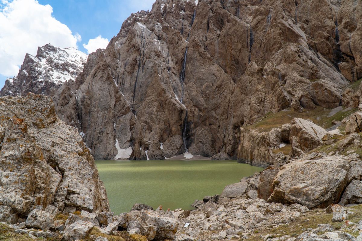 От сокровенного озера нас отделяет нагромождение камней, через которые сквозь лазейки, трещины и щели рвется наружу многотонный напор воды. Здесь уже не ручьи, но пороги и водопадики, курумы и гигантские глыбы - поток за потоком мы перебираемся на проторенную тропу. На последний перевал выкарабкиваемся как белые люди комфортно и безопасно. За ним, в чаше отвесных скал покоится Кёль Суу. Позже оно напьется ледниковых вод, поднимется и станет пронзительно-голубым, ранее было мелким и белело меловым молоком, а нынче стынет болотно-зеленым чаем Матча. Низкая вода обнажает потаенные порталы гротов; иззубренные грани расселин бьют и ласкают струи ниспадающего с вершины водопада исполинской высоты.
