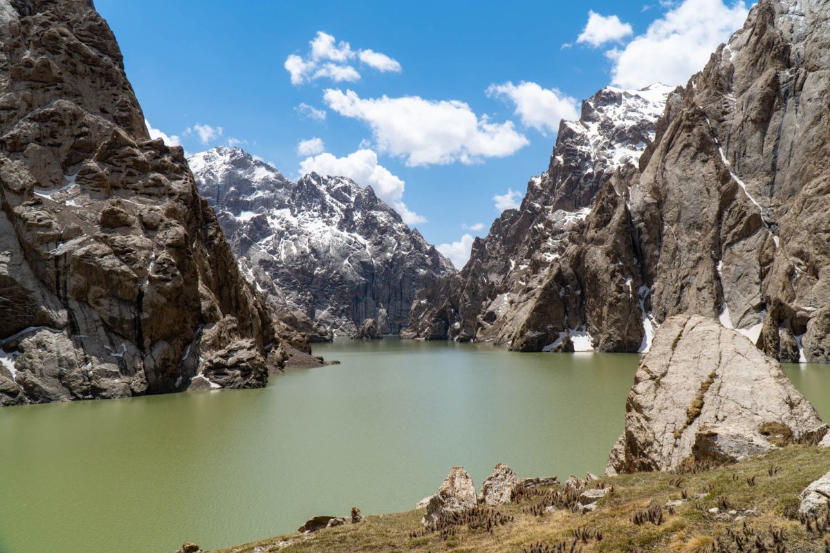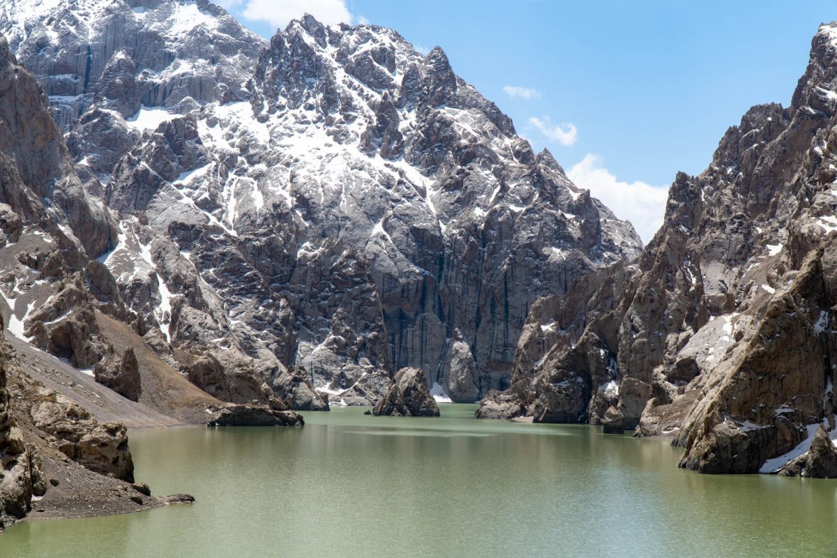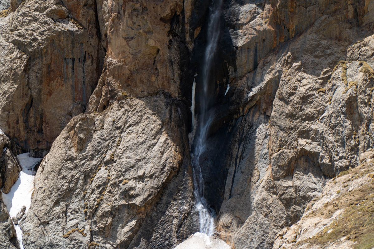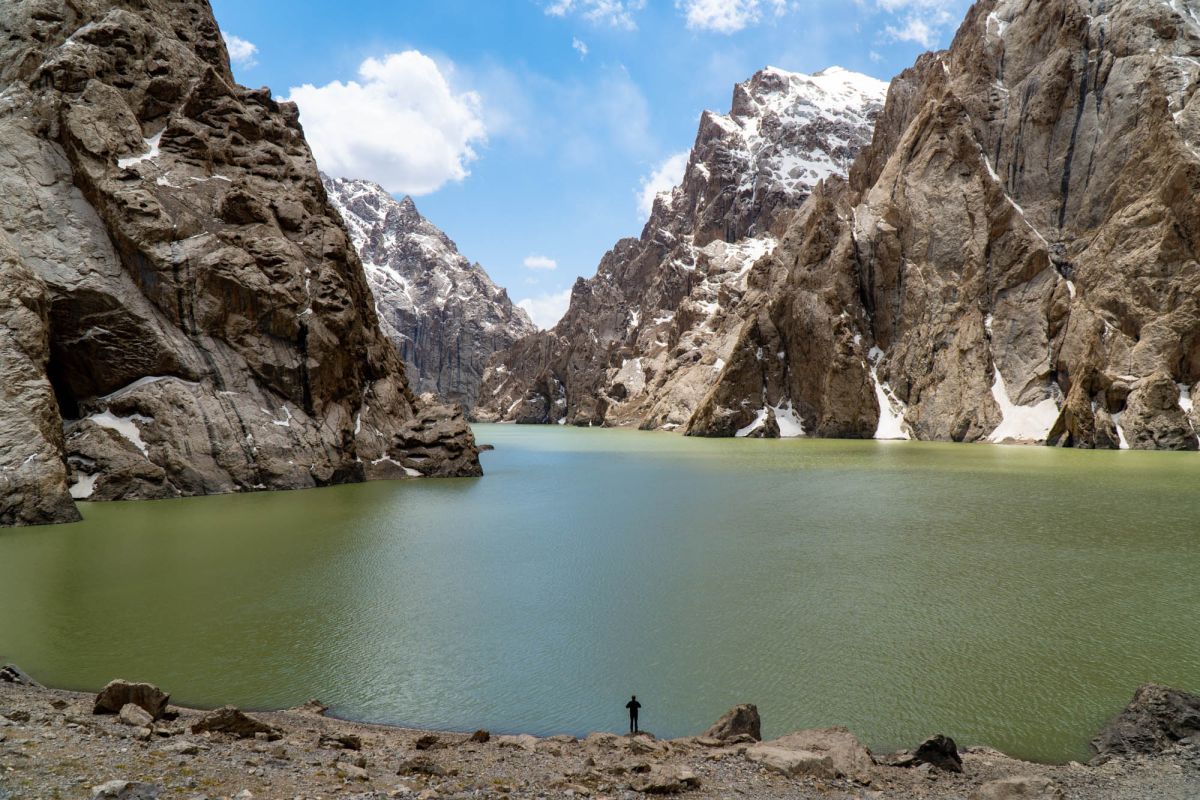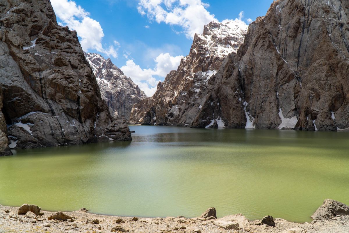 От сокровенного озера нас отделяет нагромождение камней, через которые сквозь лазейки, трещины и щели рвется наружу многотонный напор воды. Здесь уже не ручьи, но пороги и водопадики, курумы и гигантские глыбы - поток за потоком мы перебираемся на проторенную тропу. На последний перевал выкарабкиваемся как белые люди комфортно и безопасно. За ним, в чаше отвесных скал покоится Кёль Суу. Позже оно напьется ледниковых вод, поднимется и станет пронзительно-голубым, ранее было мелким и белело меловым молоком, а нынче стынет болотно-зеленым чаем Матча. Низкая вода обнажает потаенные порталы гротов; иззубренные грани расселин бьют и ласкают струи ниспадающего с вершины водопада исполинской высоты.