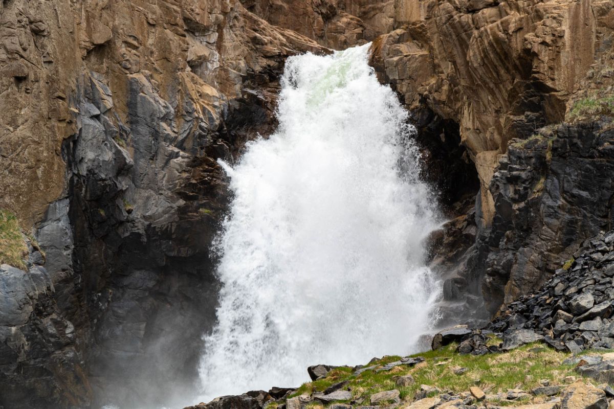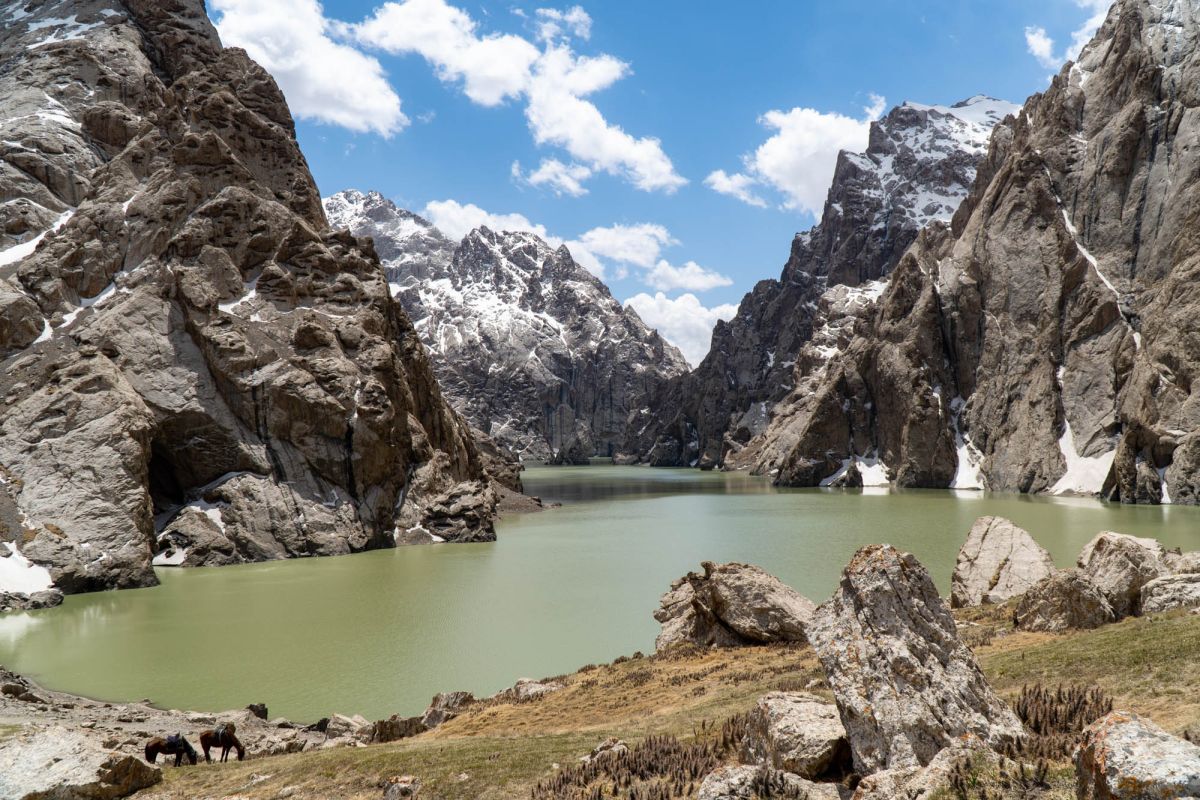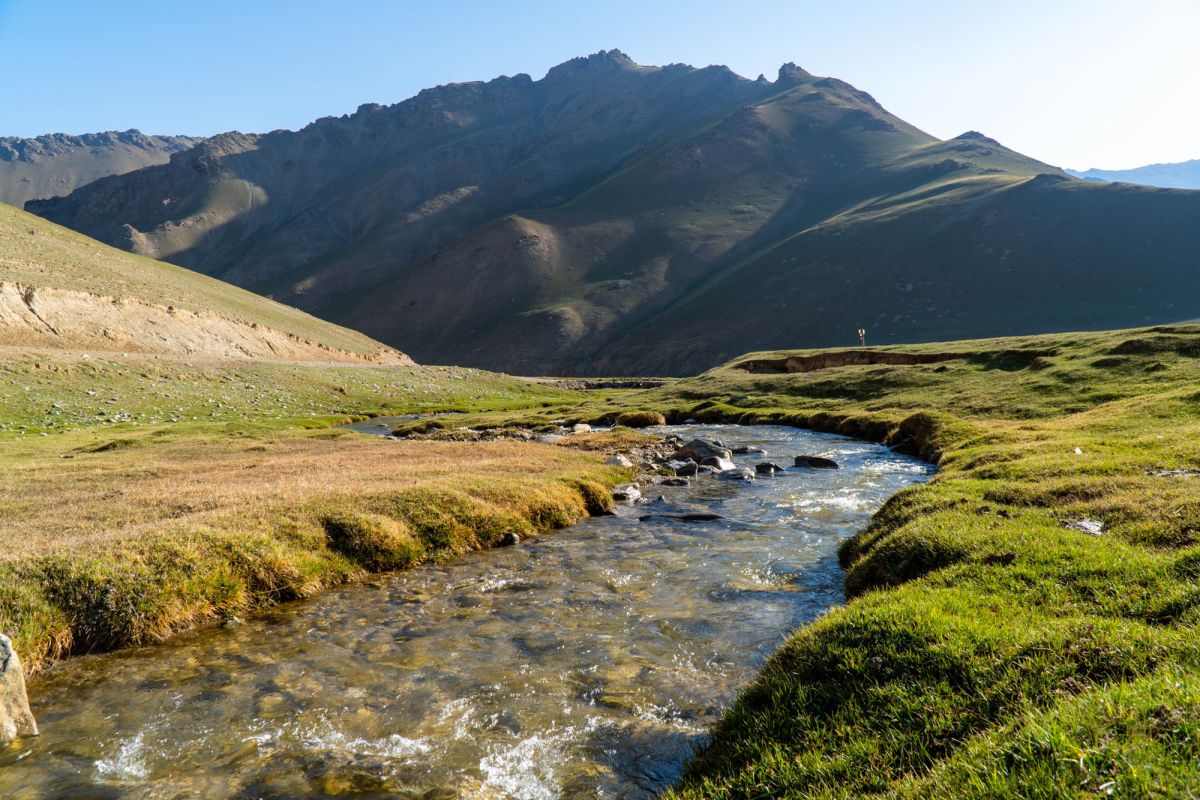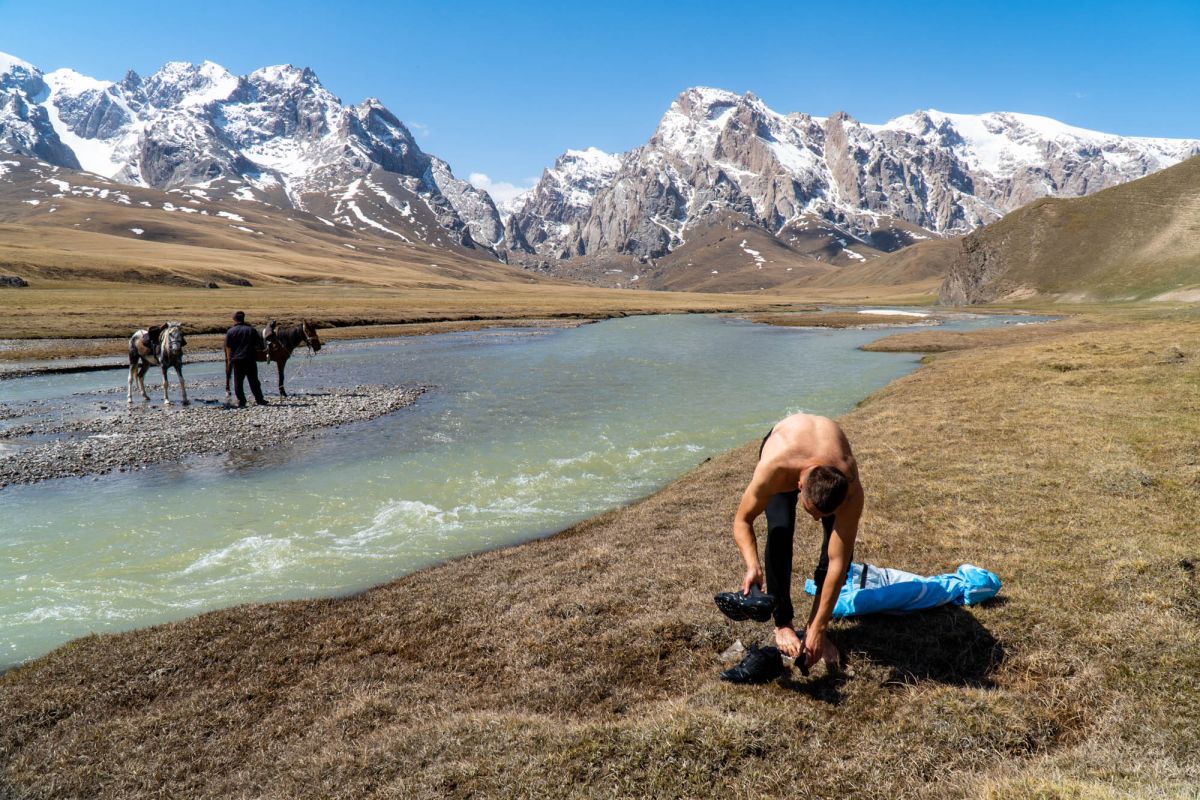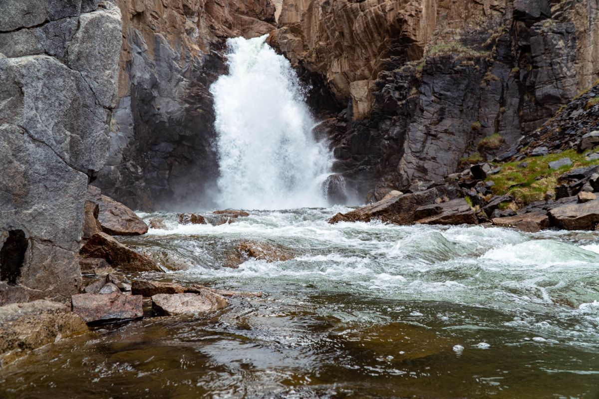 От сокровенного озера нас отделяет нагромождение камней, через которые сквозь лазейки, трещины и щели рвется наружу многотонный напор воды. Здесь уже не ручьи, но пороги и водопадики, курумы и гигантские глыбы - поток за потоком мы перебираемся на проторенную тропу. На последний перевал выкарабкиваемся как белые люди комфортно и безопасно. За ним, в чаше отвесных скал покоится Кёль Суу. Позже оно напьется ледниковых вод, поднимется и станет пронзительно-голубым, ранее было мелким и белело меловым молоком, а нынче стынет болотно-зеленым чаем Матча. Низкая вода обнажает потаенные порталы гротов; иззубренные грани расселин бьют и ласкают струи ниспадающего с вершины водопада исполинской высоты.