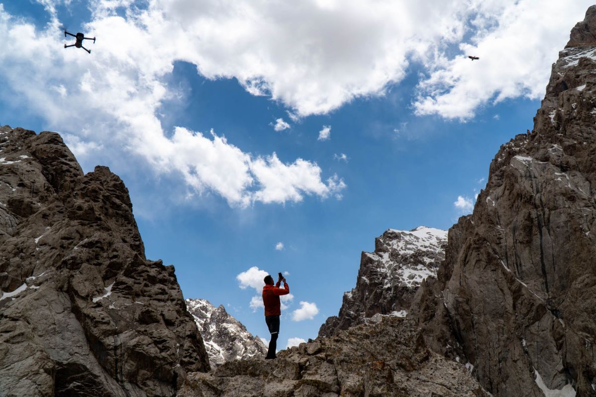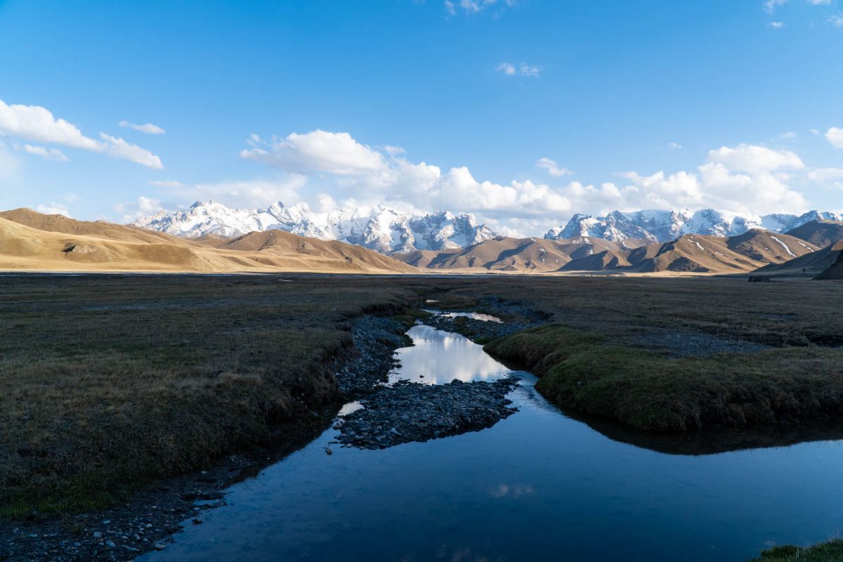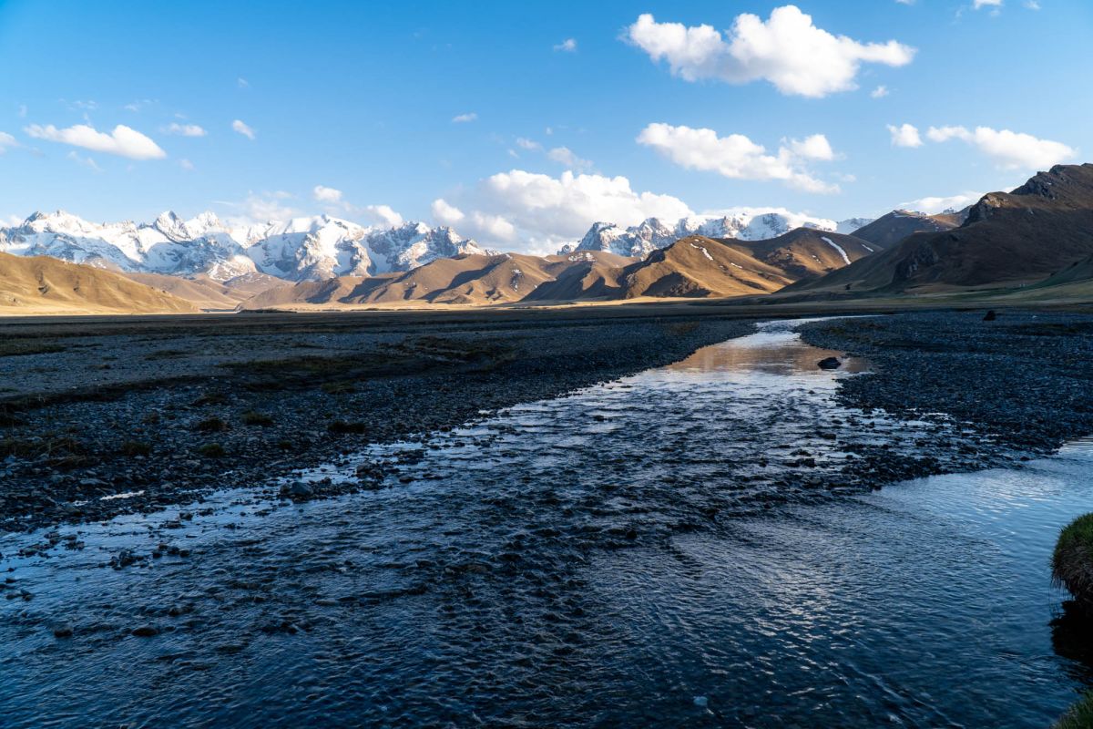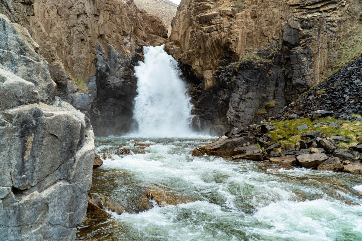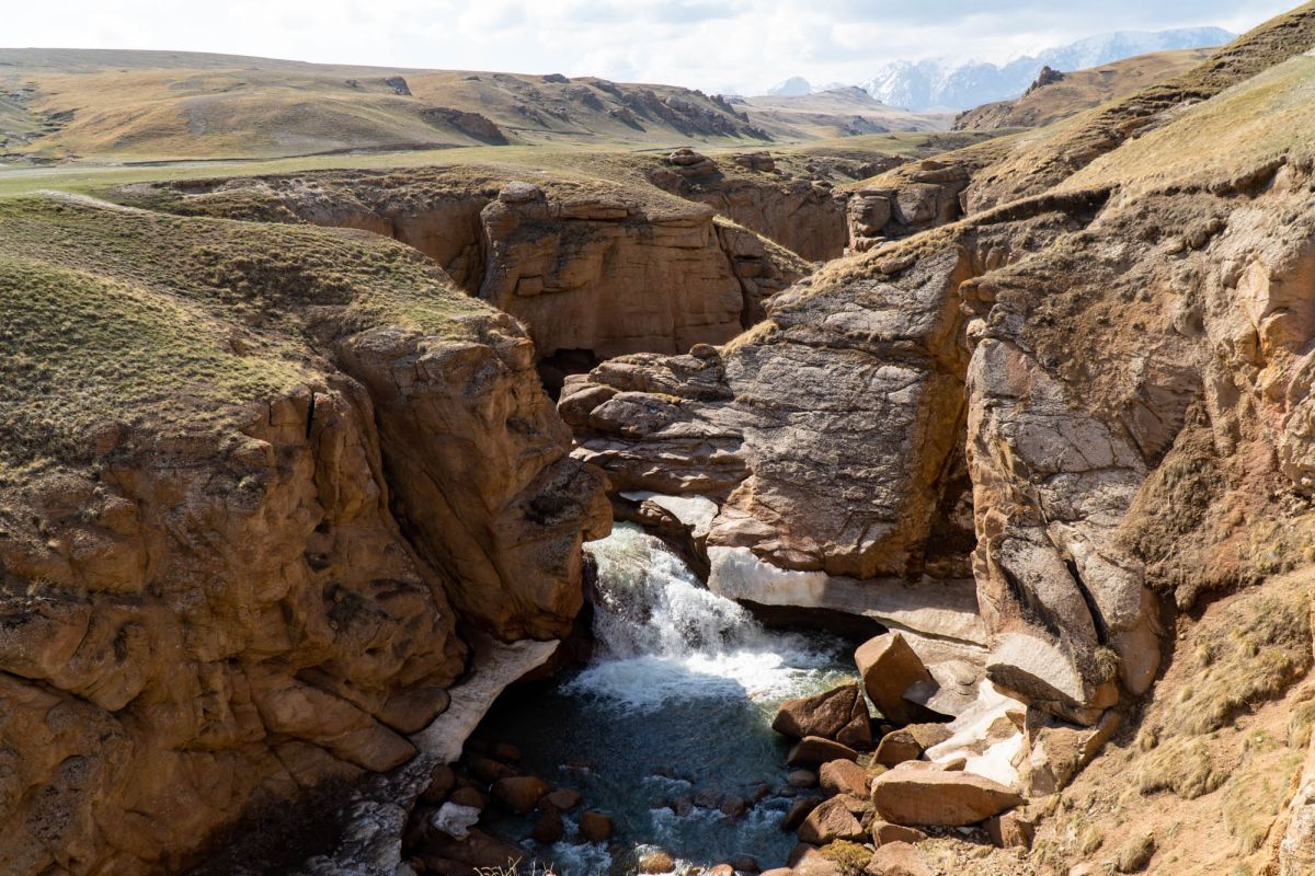 От сокровенного озера нас отделяет нагромождение камней, через которые сквозь лазейки, трещины и щели рвется наружу многотонный напор воды. Здесь уже не ручьи, но пороги и водопадики, курумы и гигантские глыбы - поток за потоком мы перебираемся на проторенную тропу. На последний перевал выкарабкиваемся как белые люди комфортно и безопасно. За ним, в чаше отвесных скал покоится Кёль Суу. Позже оно напьется ледниковых вод, поднимется и станет пронзительно-голубым, ранее было мелким и белело меловым молоком, а нынче стынет болотно-зеленым чаем Матча. Низкая вода обнажает потаенные порталы гротов; иззубренные грани расселин бьют и ласкают струи ниспадающего с вершины водопада исполинской высоты.