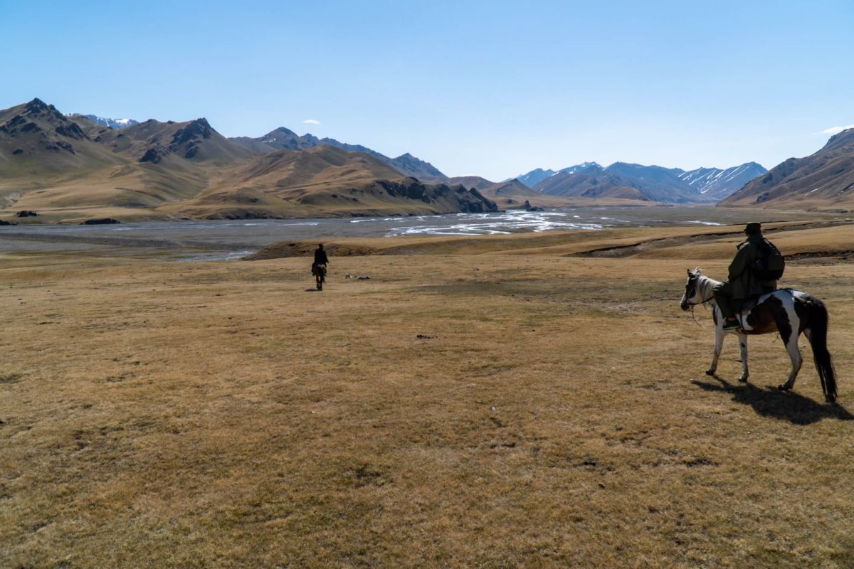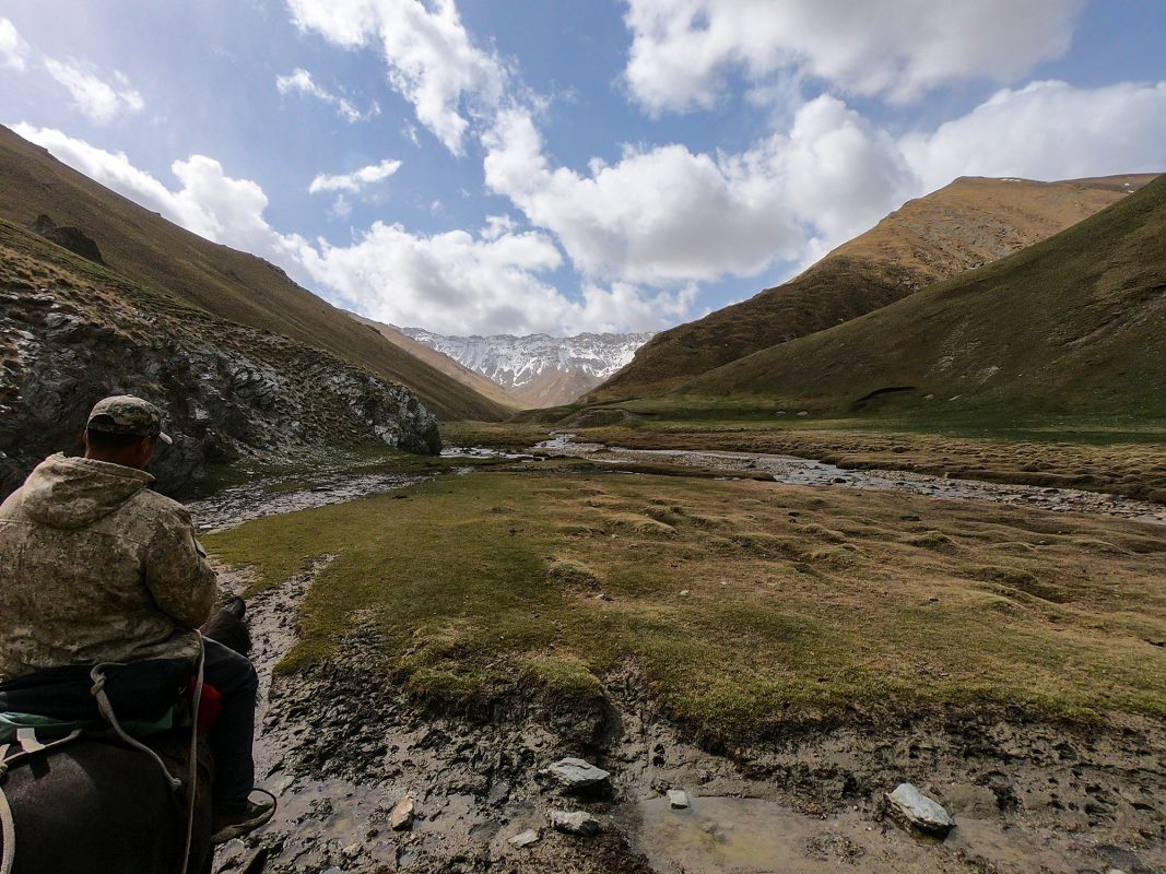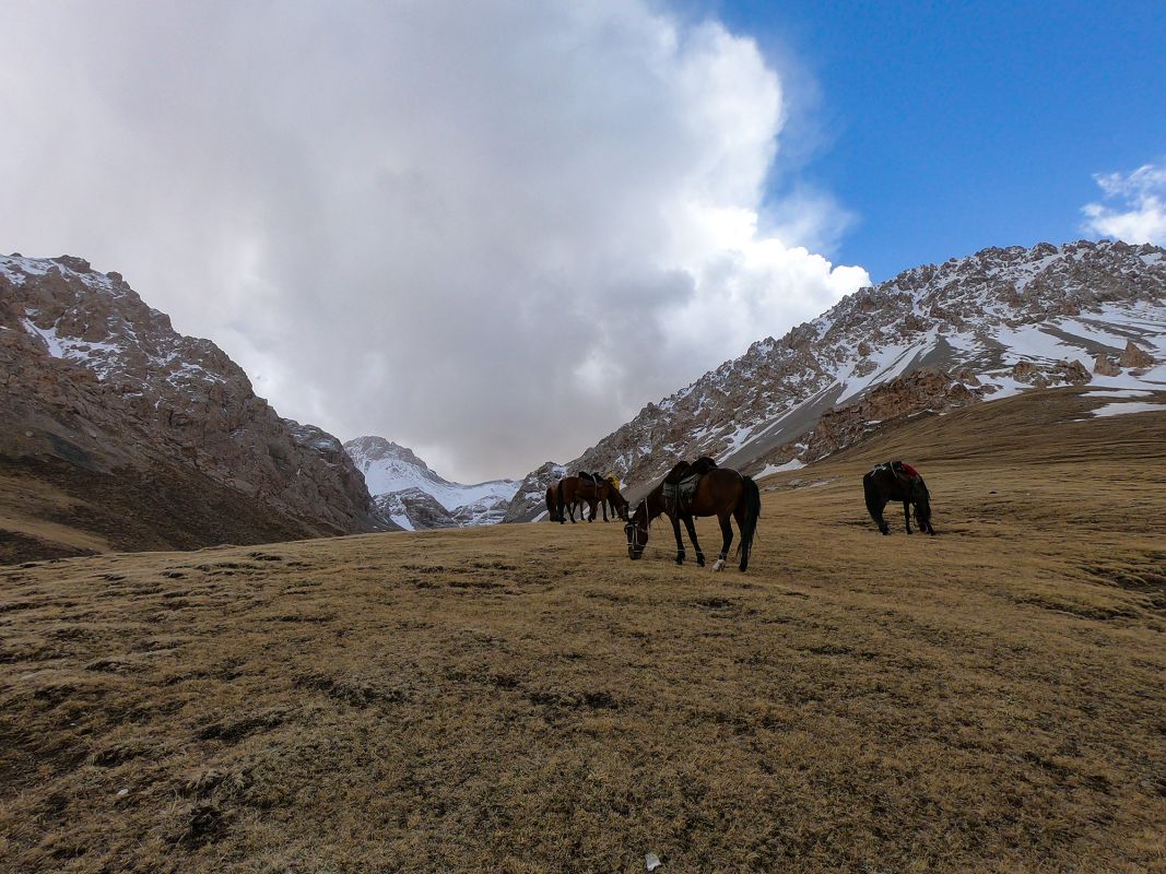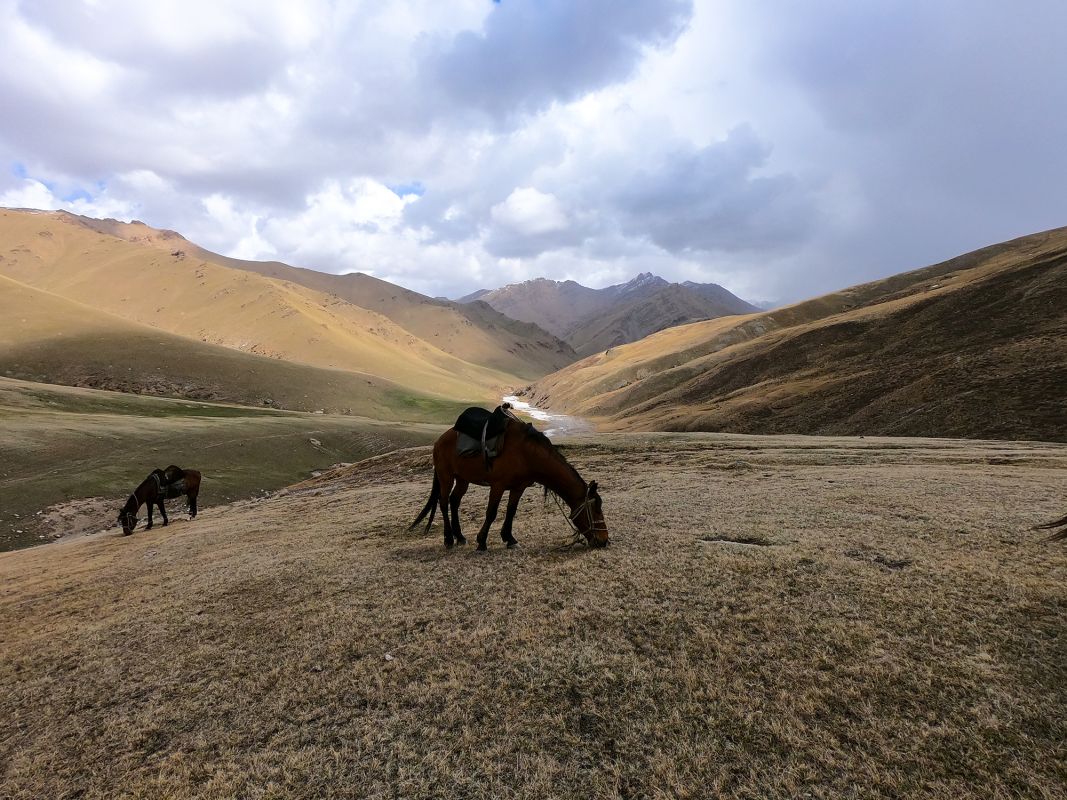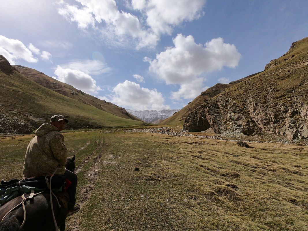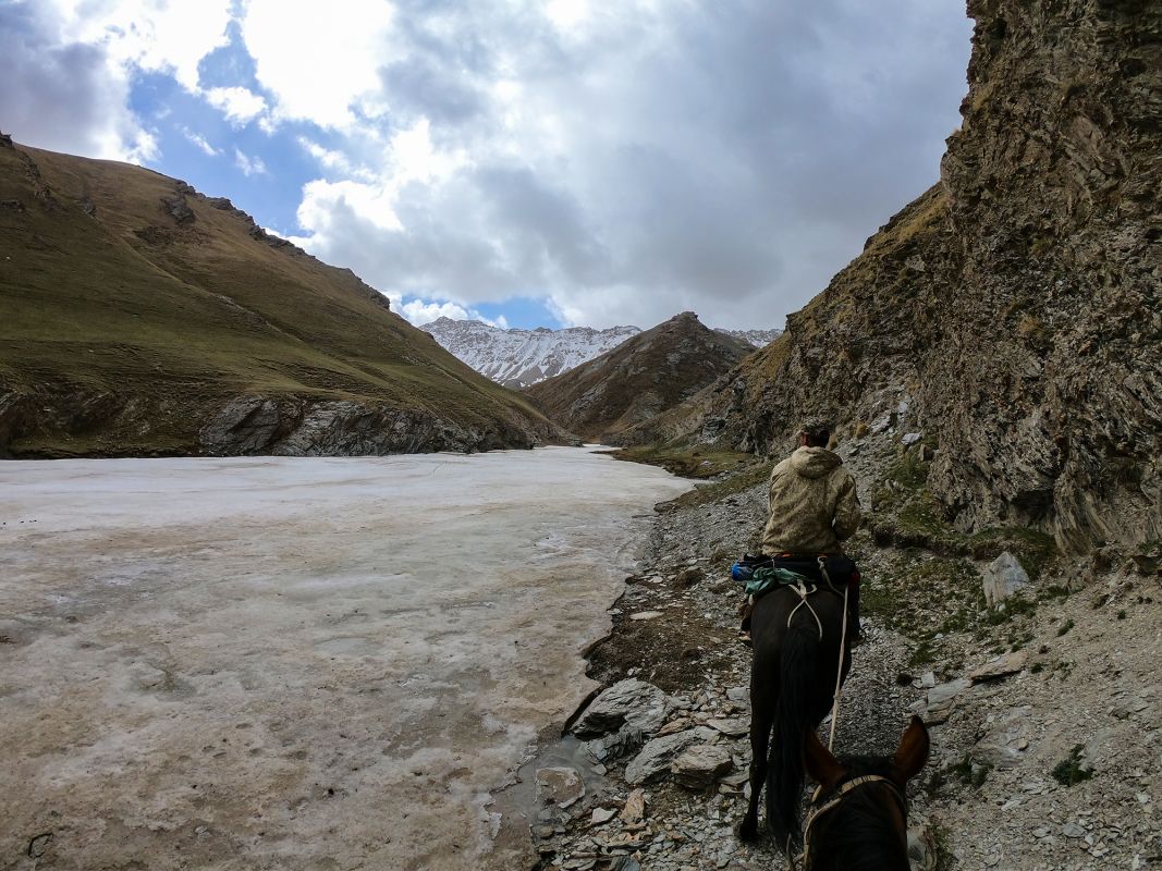 Кони нам достались все разные - и по цвету и по характеру. Мой гнедой, золотисто-рыжий, у Павла - бело-коричневый пятнистый тобиано, а у Макса серый, как предрассветный сумрак. Максимким самый резвый, они то и дело исчезают из виду, уходят то в рысь, то в галоп. Пытаюсь погнать своего, но он в ответ лишь громко пускает газы. Так неспешным аллюром и движемся по полям, холмам, через рвы и тонкими тропами по склонам. В речной долине сквозь витые потоки нужно отыскать брод на ту сторону, а чем выше, тем глубже и беспокойней беснуется Кёк-Кыя.