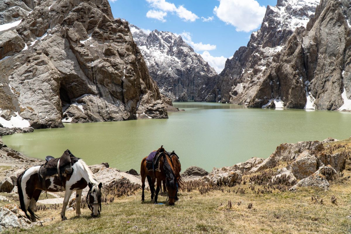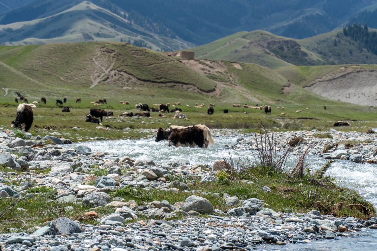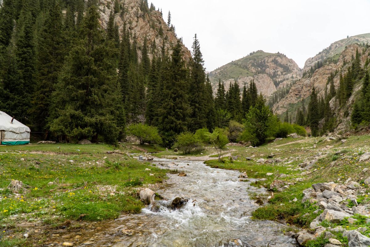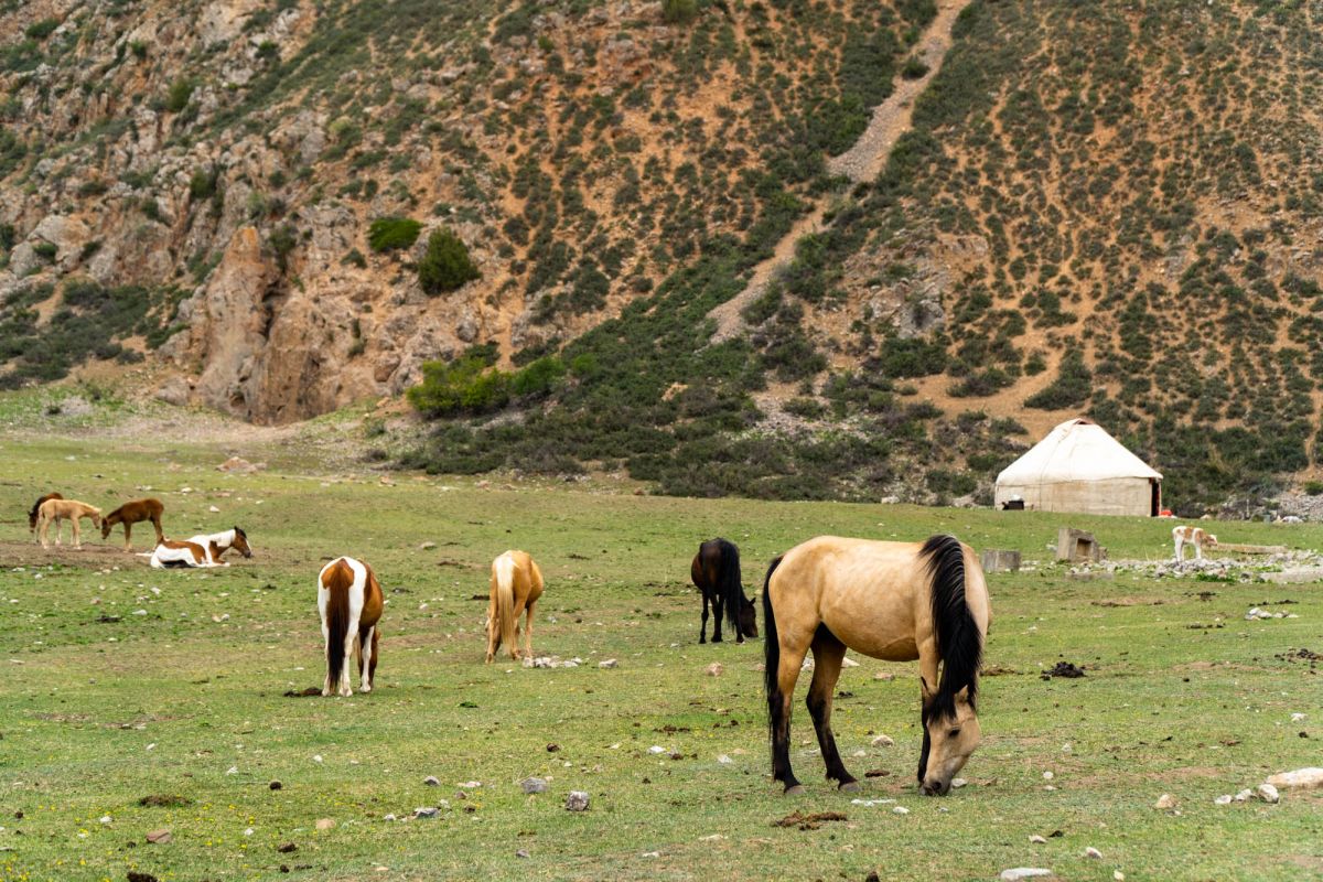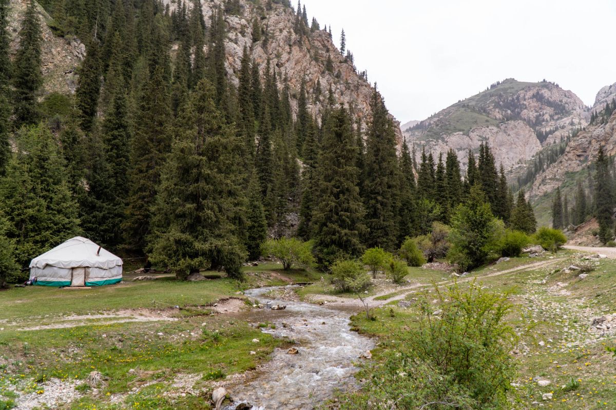 К утру тепло юрты почти развеялось. Я слышу, как ко внешней стене подошли лошади, рвут траву, жуют, звук такой насыщенный, сочный. Когда первые лучи просочились под дверь, на трубу вспорхнула пичуга и заливисто ржет конем. Имитирует со знанием дела, чудная птица. По сложившейся традиции, завтрак накрывается к 8 утра, едим что хозяйка подаст. Этот день посвящен походу на высокогорное ледниковое озеро Кель Суу - вверх по реке, на высоту 3500 м.