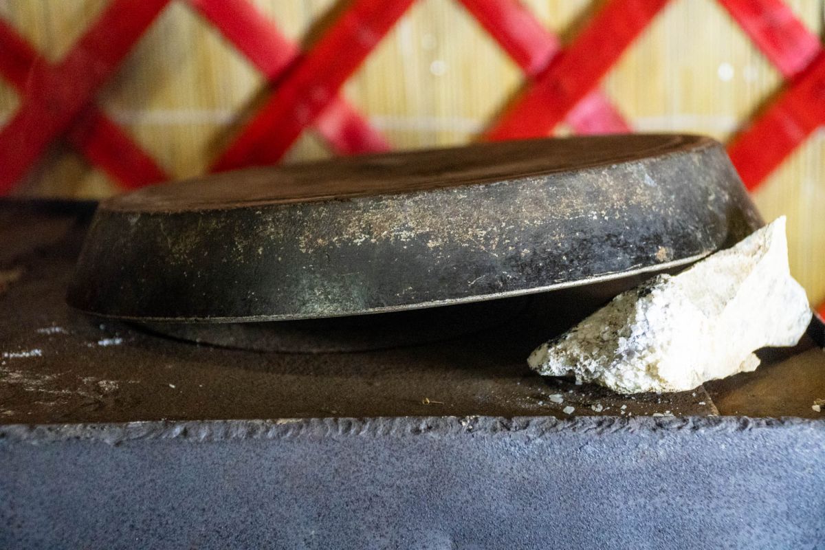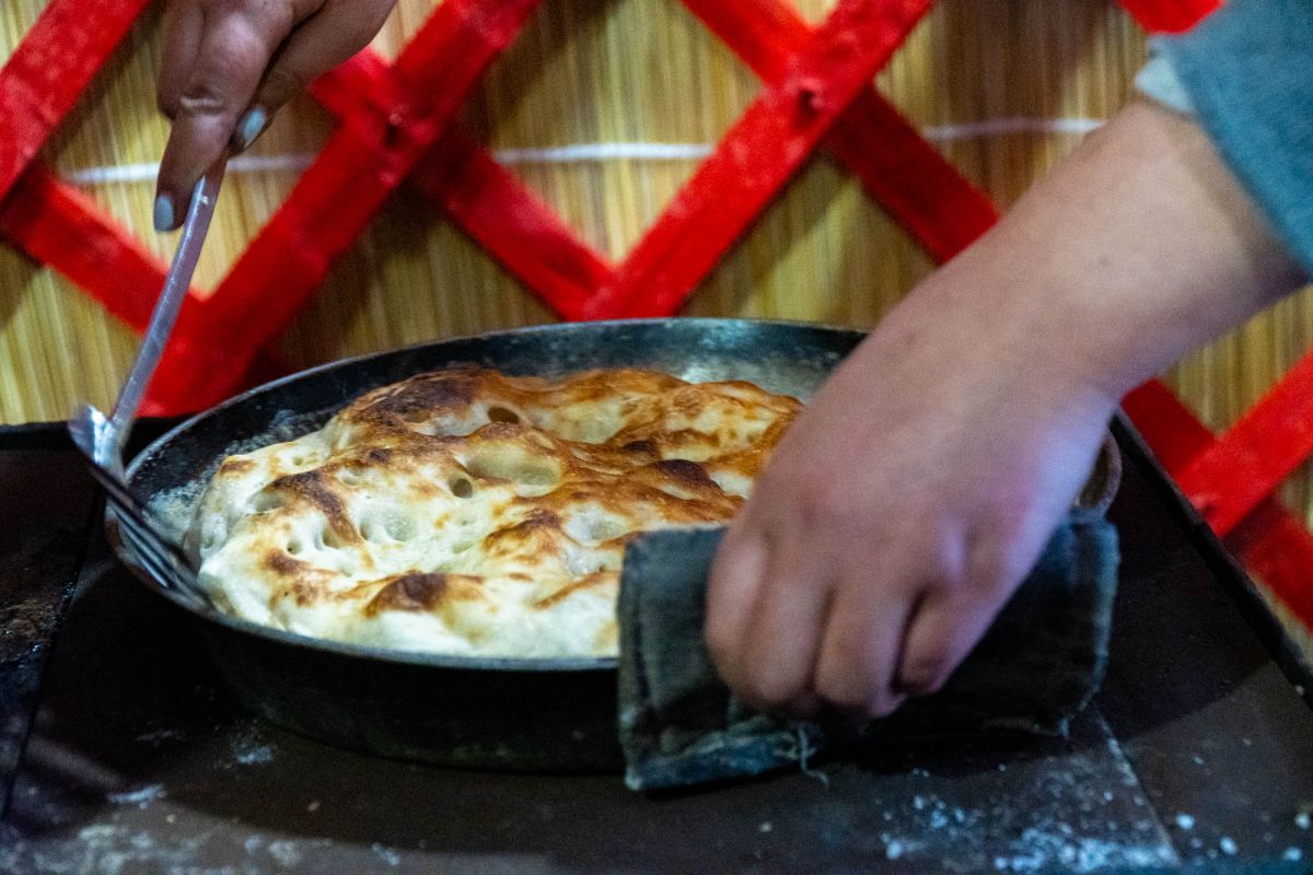 Зато слово женщины оказалось крепко и Ак Морал, как и обещала, открывала нам секреты изготовления своего изумительного хлеба. Мастер-класс устроили прямо в нашей юрте - печку раскачегарили кизяком, чтобы быстрее получить нужный жар. Тесто было заготовлено заранее. Плотно обступив жаркую буржуйку наблюдали за чудом превращения липкой бледной массы в румяный ароматный кругляш. Кому интересно, ловите рецепт: