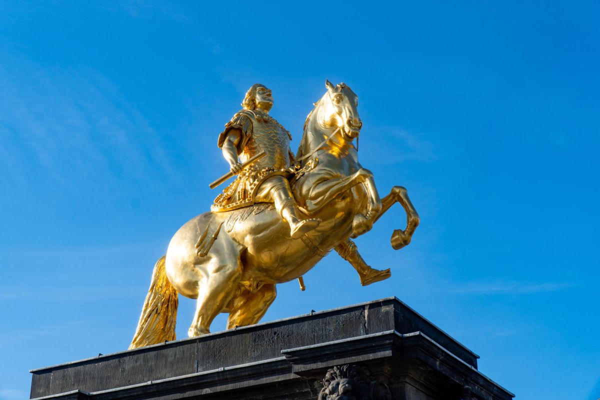 Этот памятник, самый известный в Дрездене, был построен в 1732-1734 годах и изображает курфюрста Фридриха Августа I, более известного как Август Сильный, едущего на коне на северо-восток в старинном одеянии. Эта статуя была выкована из меди кузнецом Людвигом Видеманном и позолочена огнем. Золотой всадник реставрировался несколько раз, последний раз в 2002/2003 году. С тех пор он снова засиял славой примерно с 500 граммами сусального золота.