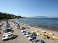 Пляжа фактически нет - а то, что есть - полоска серой земли. Каждое утро наносит водорослей, которые "бой" начинает убирать часиков так в 10 утра... между тел загорающих туристов.
