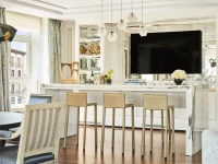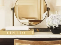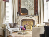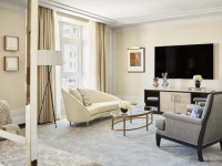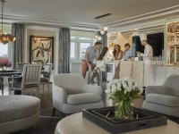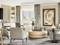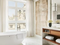 With a fifth-floor setting at the building’s triangular point, this prestigious suite is designed for glamorous socializing. The style is youthful and dynamic, mixing antiquities with modern furnishings. The deluxe primary bedroom includes its own sitting area, dressing room and a light-filled bathroom with a free-standing oval tub.