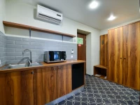 Мини-кухня (электрический чайник, мини-холодильник, микроволновая печь, раковина, посуда)