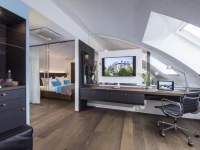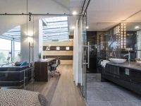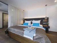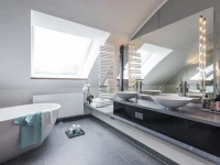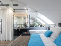Интересный дизайн всего отеля. Стеклянно- металлическое что-то. Номер 516 на пятом этаже. Лифт идет только до 4 этажа, далее с чемоданом по лестнице. Мансардный этаж. Окно под углом. Как раз ночью был ливень – грох