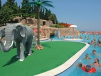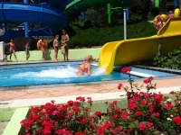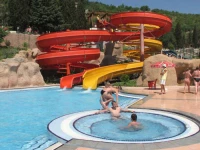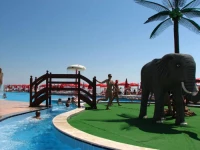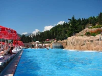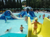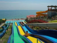 • Аквапарк включает в себя 6 бассейнов, 14 водных горок, 4 платформы для спуска с горок, площадки солярия, VIP-зона