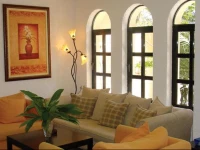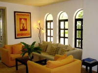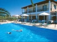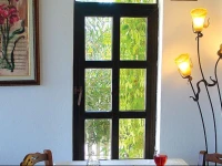 Вся территория состоит из бассейна и терраски с 8-ю столиками. Окна всех номеров первого этажа выходят на заросли кустов или на дорогу.