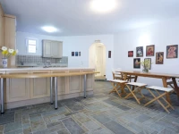 This is a four bedroom villa . On the first floor there is a large living room, the master bedroom with a private bathroom and a bedroom with twin beds also with a private bathroom. On the second floor there is a fully equipped kitchen a living room a bathroom and an attic with a double bed. On the right side of the villa there is a big bedroom with twin beds a bathroom and a small living area inside.