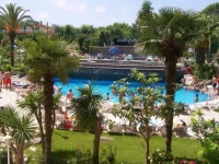 Отдыхали мы два взрослых с ребенком в этом отеле в начале июля 2008. Шумно и суетно, ощущение, что жили на стадионе или вокзале. Молодежные группы (детки 11-14 лет) свозились автобусами. Эти детки были везде: в бассейнах, в т.ч. в лягушатнике, в лифтах, орали друг другу с балконов, создавали огромную(!!!) очередь в столовой. Не будь ИХ, остальное было бы более-менее сносно. Территория у отеля боль