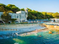 Арендуемый пляж: шезлонги, зонтики. В 350 м от здания гостиничного комплекса "1000 и одна ночь", галечный, благоустроенный, душ, туалет, медпункт, детская площадка, бар, прокат принадлежностей для дайвинга, подвоз на микроавтобусе (3 мин.)